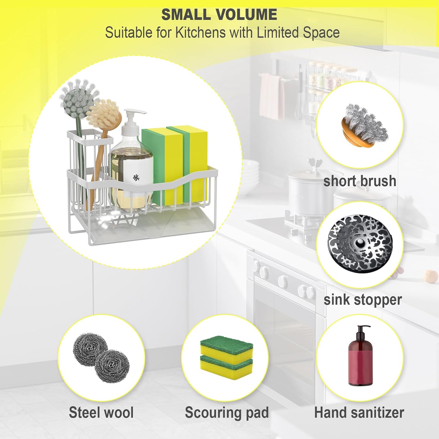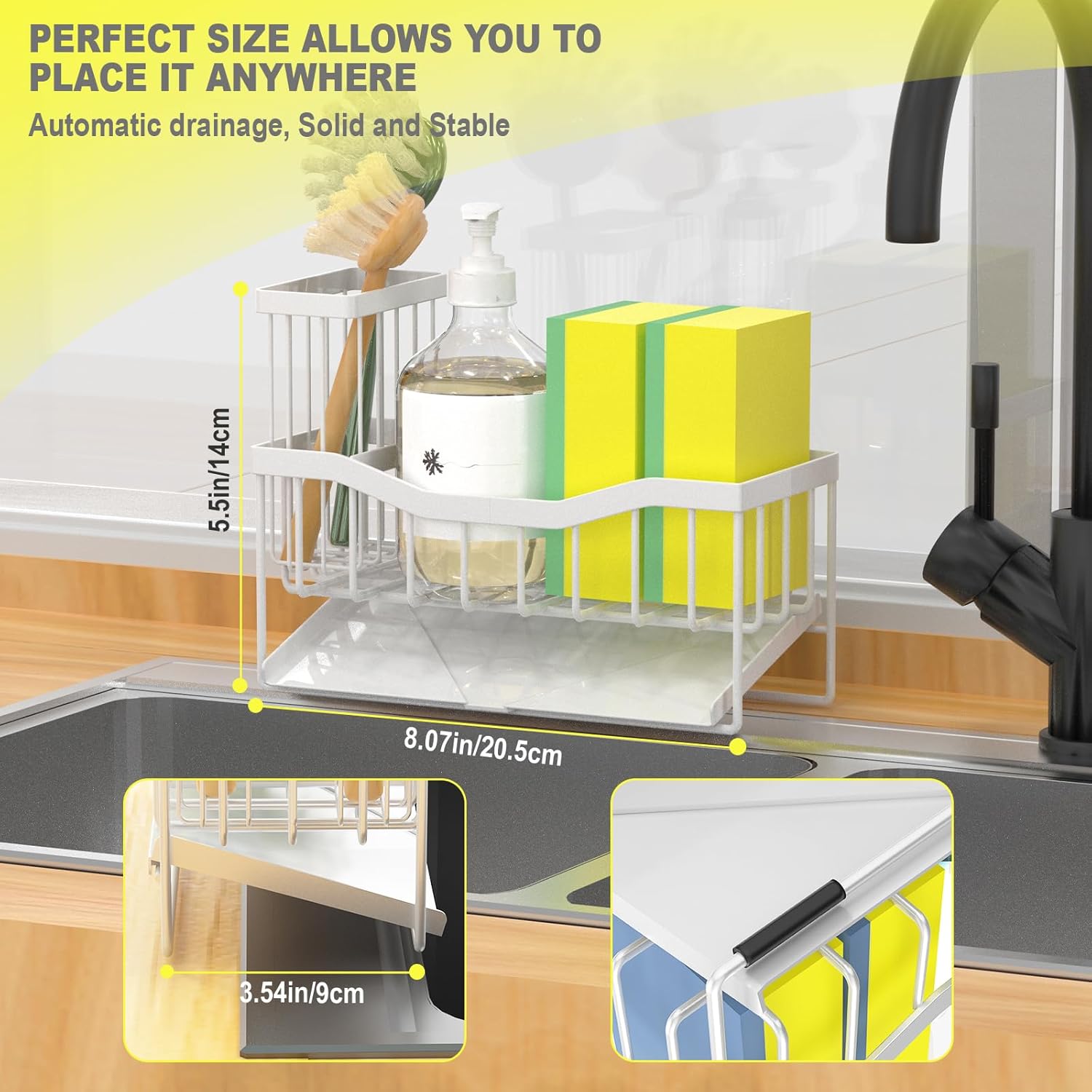 - ăSmall VolumeăKitchen sink organizer is suitable for kitchens with limited space. It measures only 8.10"*3.60"*5.50"and can hold a detergent bottle, 2 sponge balls or sink stopper. It fits neatly on your countertop near the sink without taking up too much space and make your kitchen look cleaner.