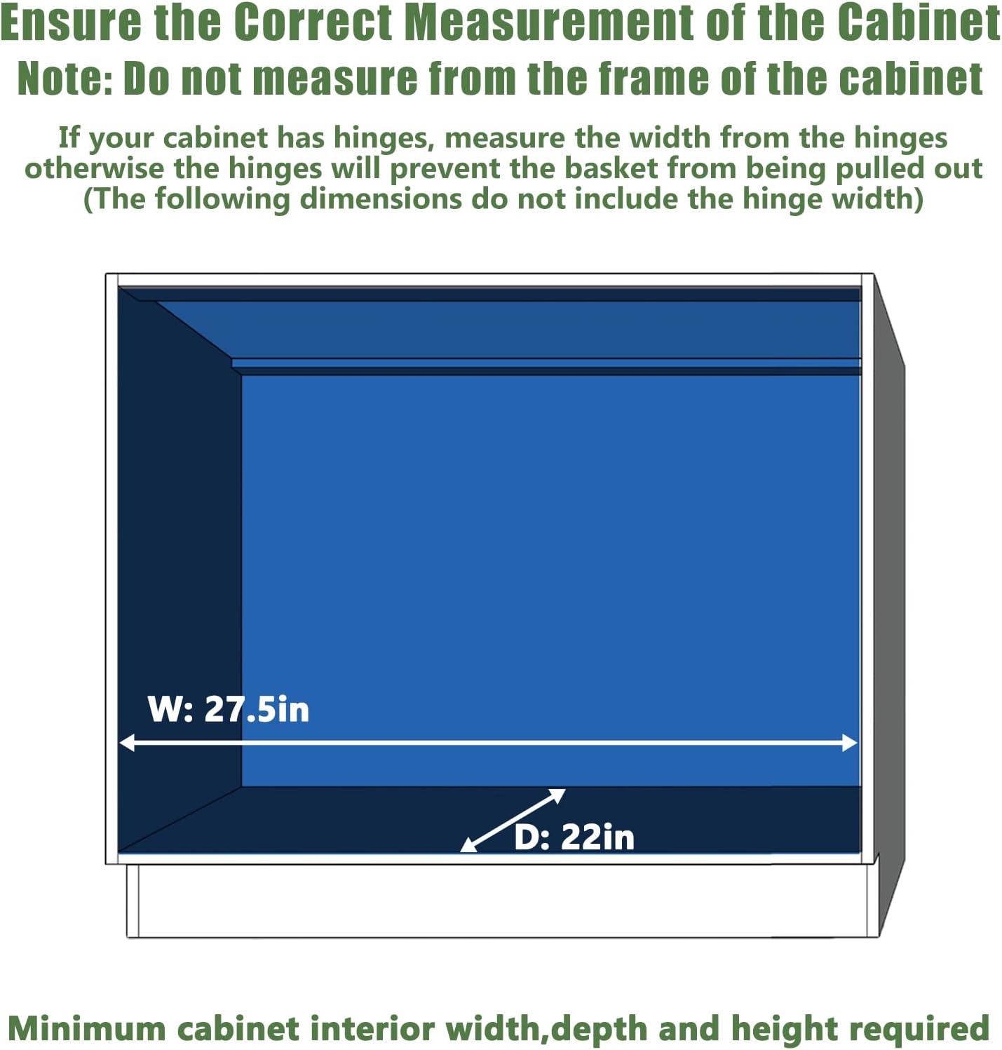 - Measure your cabinet before purchase. Our product is 27 inches wide and 21½ inches deep, so please make sure your opening is 27½ inches or more, and the depth is 22 inches and more.