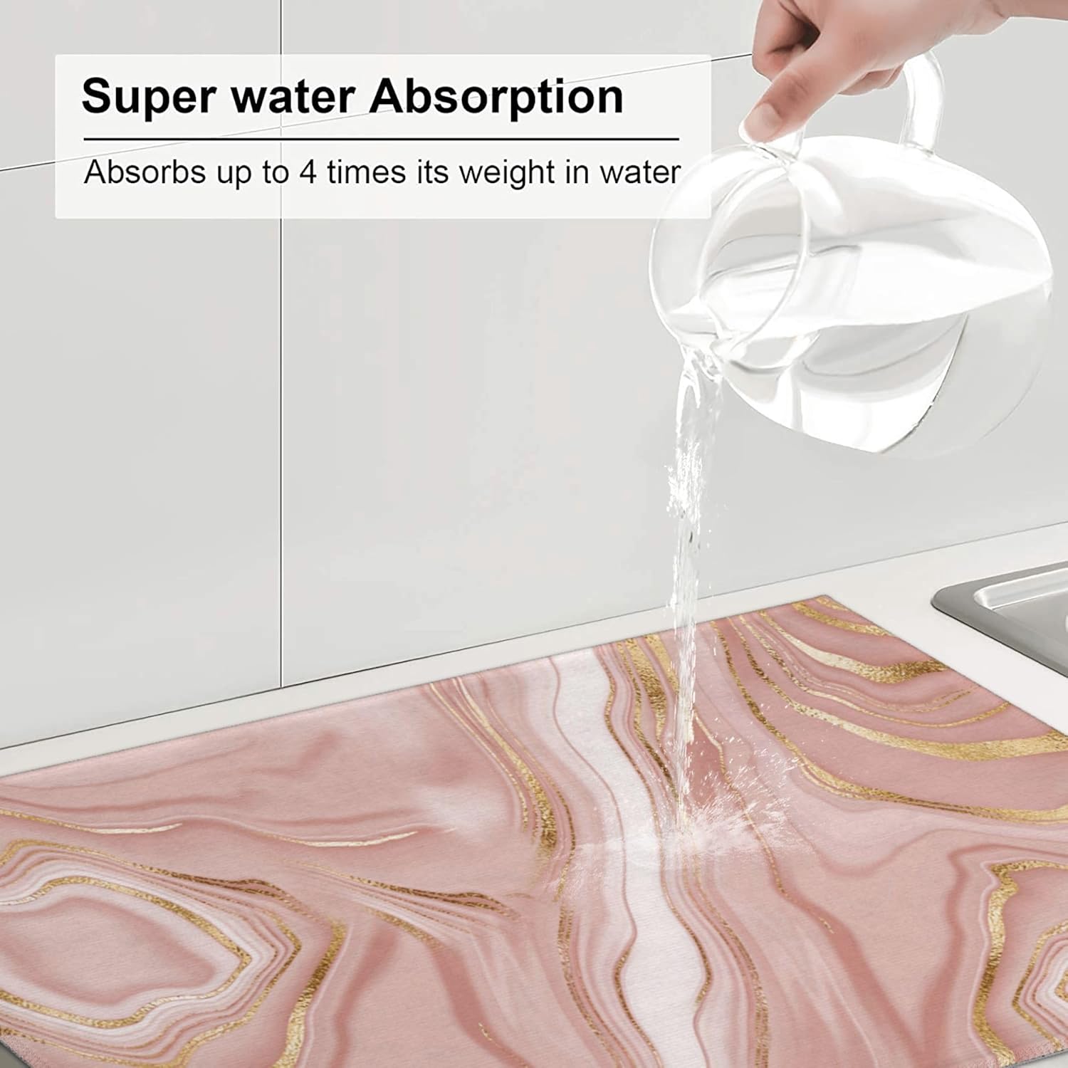 Pink Golden Dish Drying Mat for Kitchen Counter Absorbent Reversible Rose Pink Modern Drying Pad Dark Kitchen Decor Marble Dish Drainer Rack Mats 18"x24"