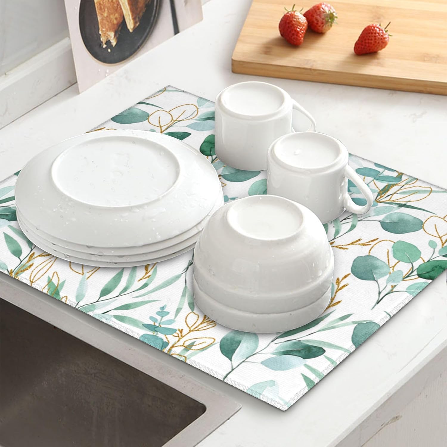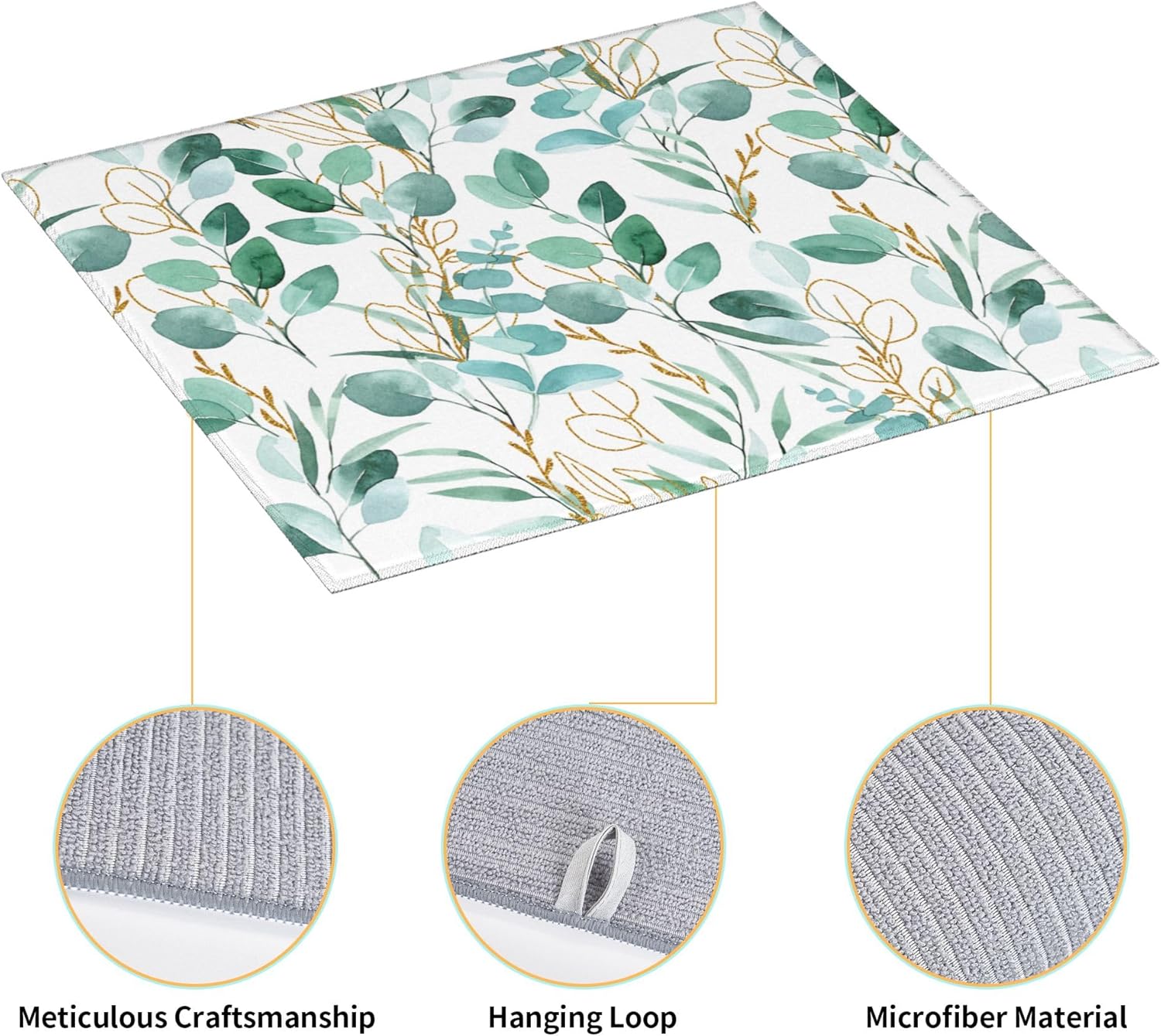 Sage Green Leaves Dish Drying Mat for Kitchen Counter Cute Botanical Dish Drainer Rack Mats 16"x18" Absorbent Reversible Drying Pad Spring Summer Kitchen Decor