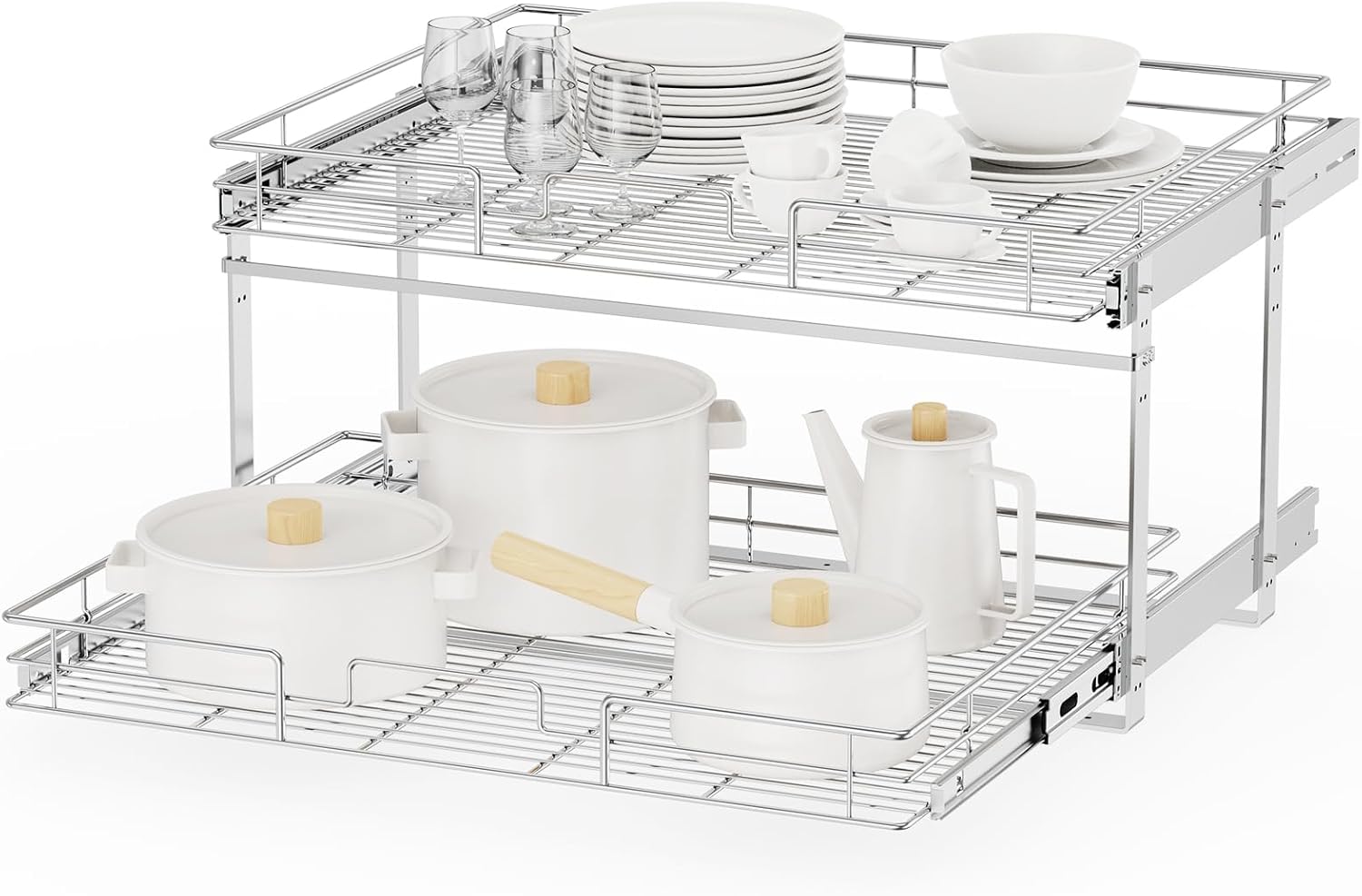 - 【Space-saving Pull Out Cabinet Organizer】This slide out cabinet organizer can maximize your cabinet space. Makes it super easy to store, organize, and access your stand mixers, pots, pans, baking sheets and other kitchen accessories, cleaning supplies, and various odds and ends. Now your cabinet is no longer just stacks of pots pans.