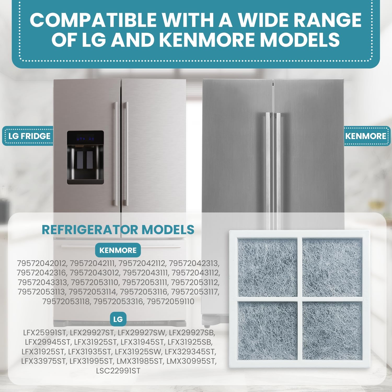 - Perfect Compatibility: LT120F replacement refrigerator air filter compatible with a wide range of L G and Ken more refrigerators models, LG Thin Q fresh air filter replacement with Kenm ore Elite refrigerators and systems like ThinQ , Multi Air Flow and more. Filter Dimensions: 3.23" x 3.23".