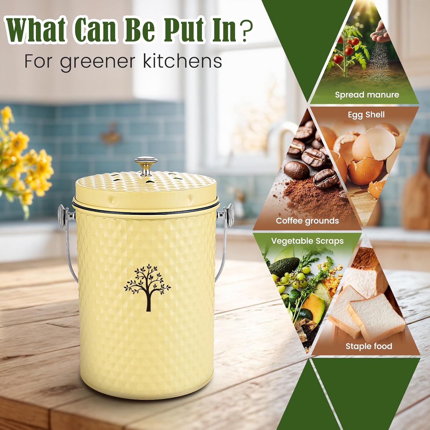 - 【COMPOST BIN LARGE CAPACITY】:1.0 gallons offers ample space for collecting your organic kitchen and food waste for a week.Such as discarded fruit vegetable scraps, shell bones, leftovers, tea bags, and save your trips to your outdoor compost piles or bins.