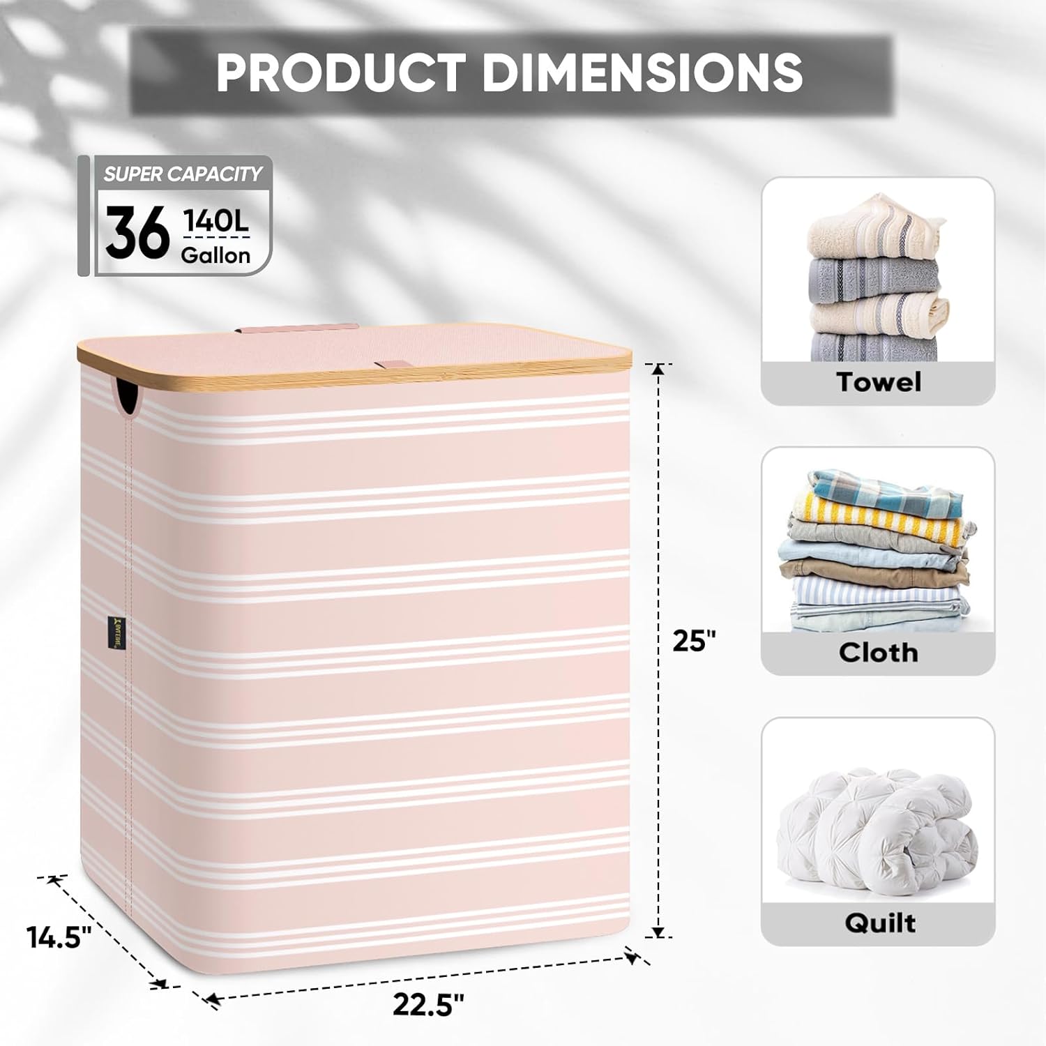 BALEINE Laundry Hamper with Lid, Tall Laundry Baskets with Bamboo Pull Handles, Large Laundry Bin with Internal Support (36 Gal/140L, Pink Pinstripe)