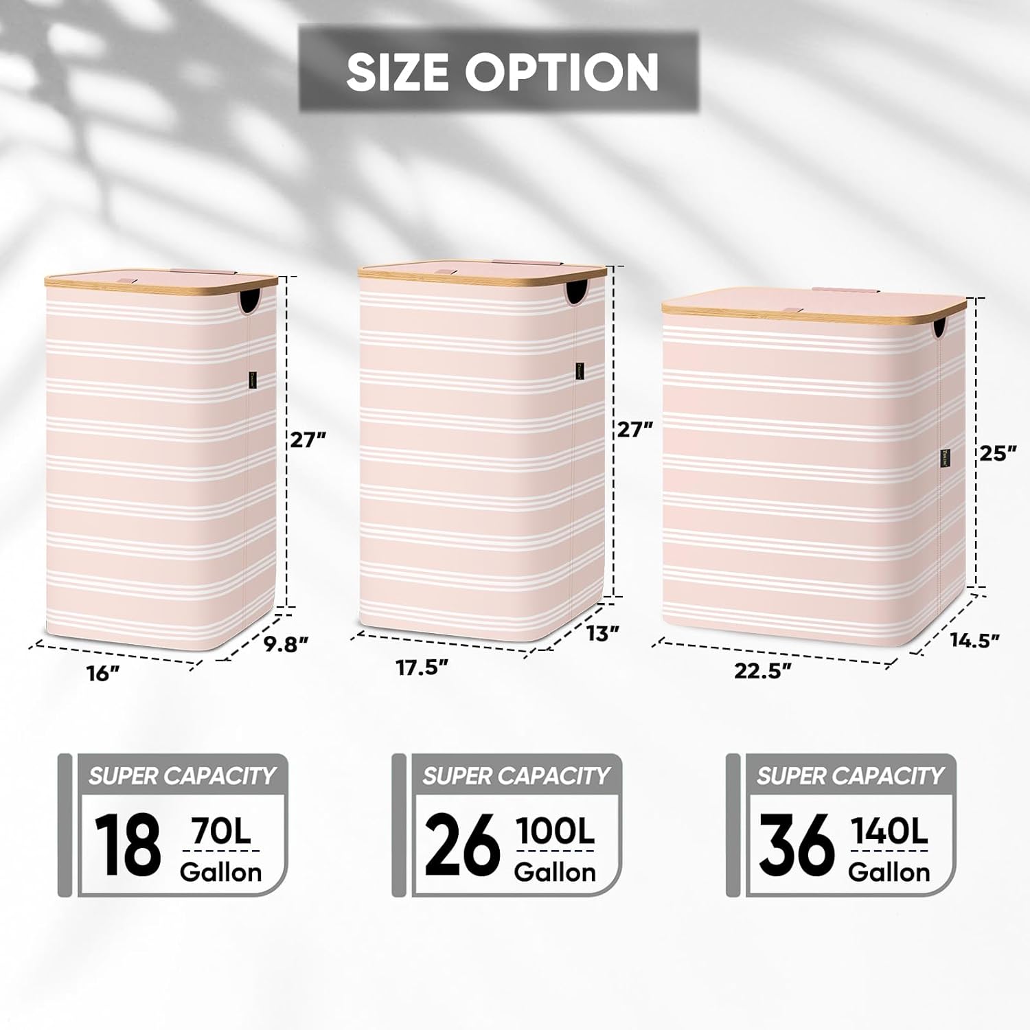 BALEINE Laundry Hamper with Lid, Tall Laundry Baskets with Bamboo Pull Handles, Large Laundry Bin with Internal Support (18 Gal/70L, Pink Pinstripe)