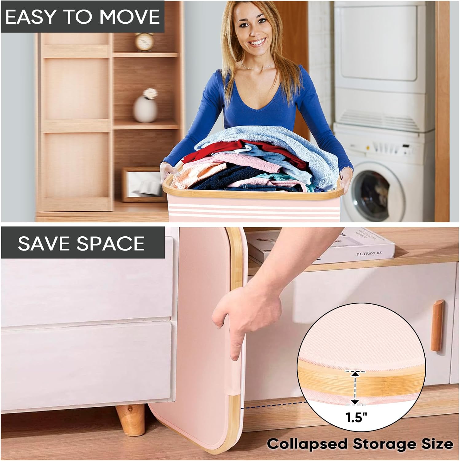 - [DURABLE AND ECO-FRIENDLY] We care about the environment, which is why our laundry hamper is made from sustainable bamboo rim. Bamboo is known for its exceptional strength and durability, ensuring this clothes hamper's handle will withstand the test of time. By choosing our eco-friendly laundry basket organizer, you're making a conscious decision to reduce your carbon footprint.