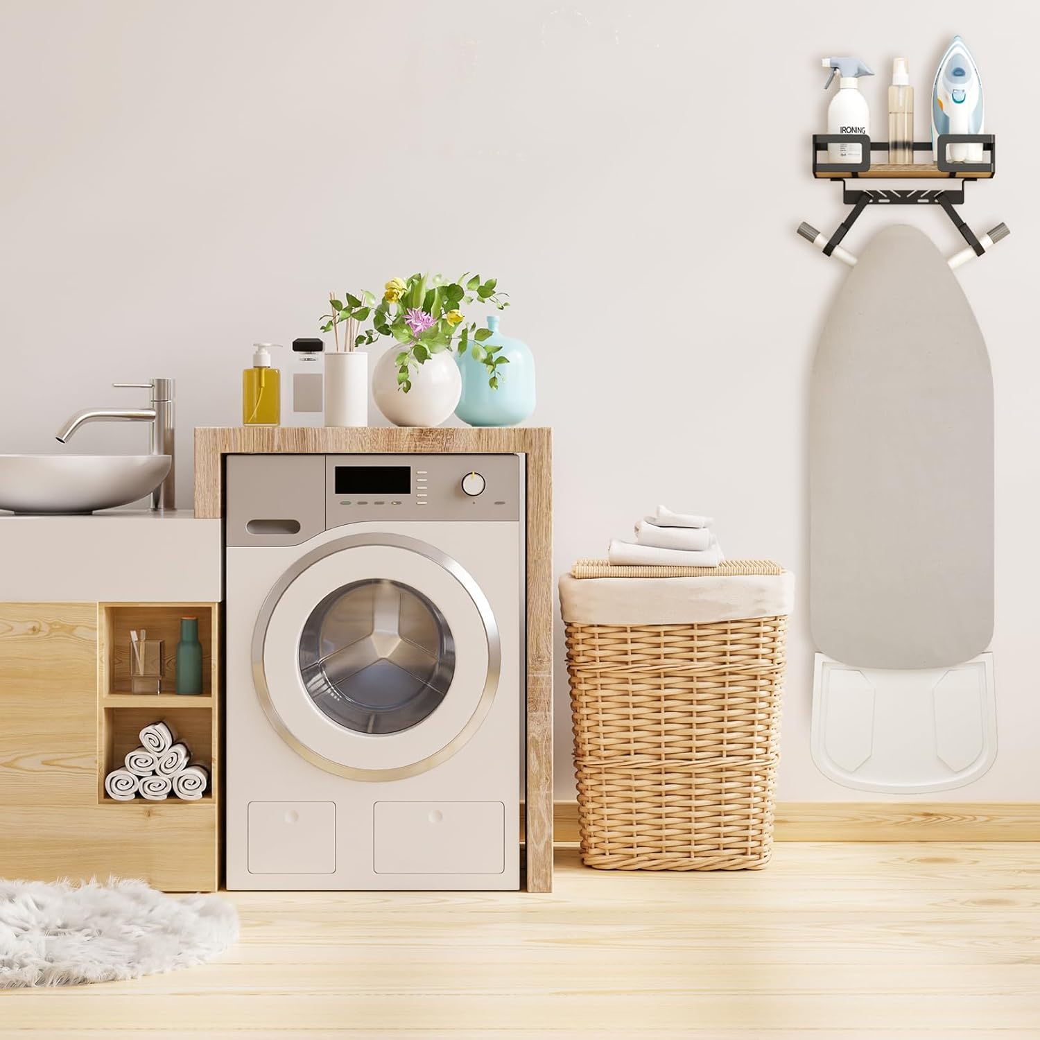 - WIDENED FRAME IS MORE STRONG: The laundry room accessories ironing board are made of iron and natural wood. The wider frame makes it more sturdy and durable with 2 wider hooks. It creates a rustic and modern style while keeping your storage items safe.