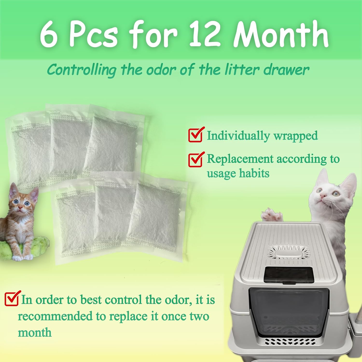 - 😺6 Pcs for 12 mth: Each bag is individually sealed in bag, you can replace according to your cat's usage patterns. However, in order to best control the odor, it is recommended to replace it once two month, so that 6 litter box odor filter bag will last about 12 months.