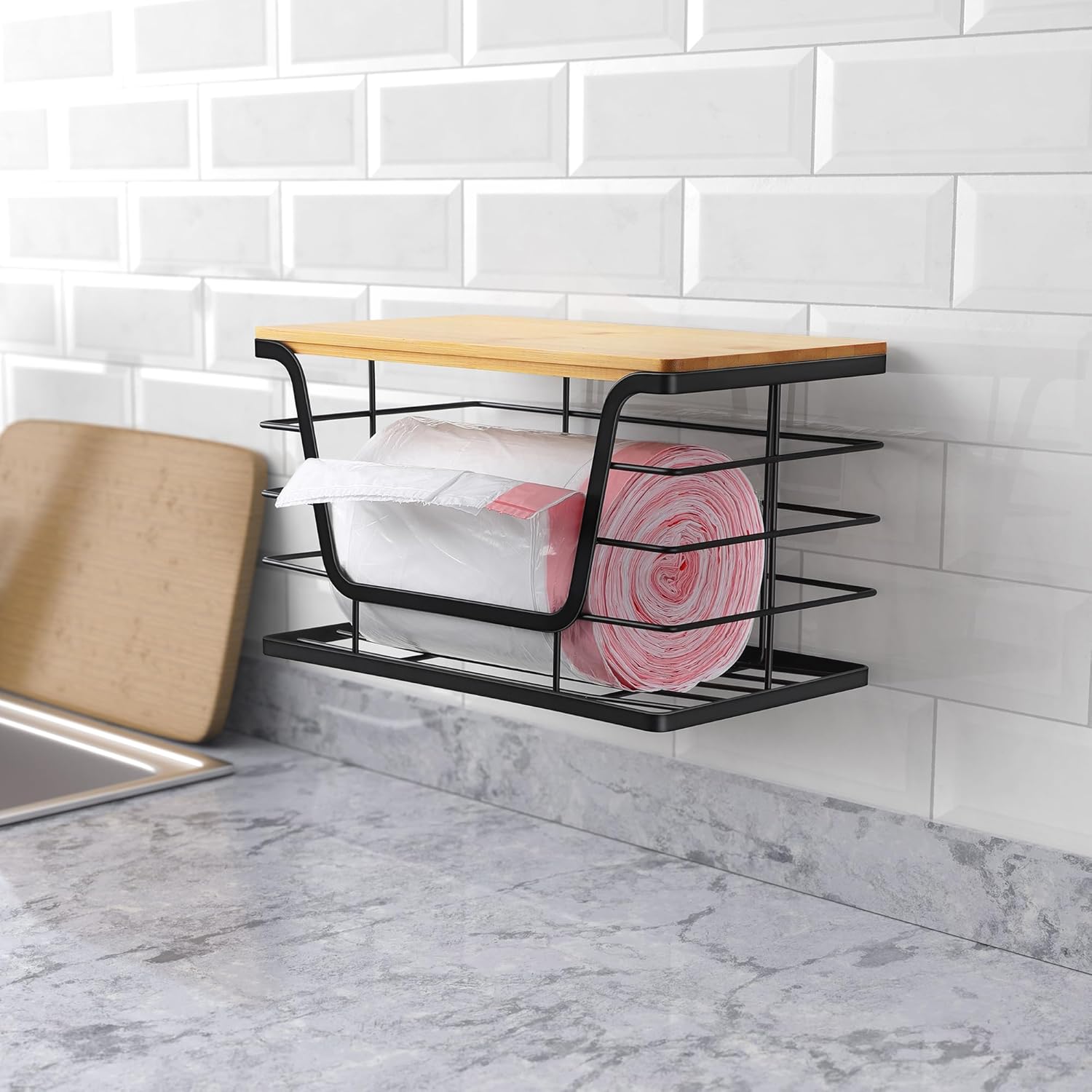 ALOCEO Extra Large Trash Bag Holder Dispenser With Bamboo Top, Wall Mounted Garbage Bag Dispenser Roll Holder for Kitchen Laundry Room Organization