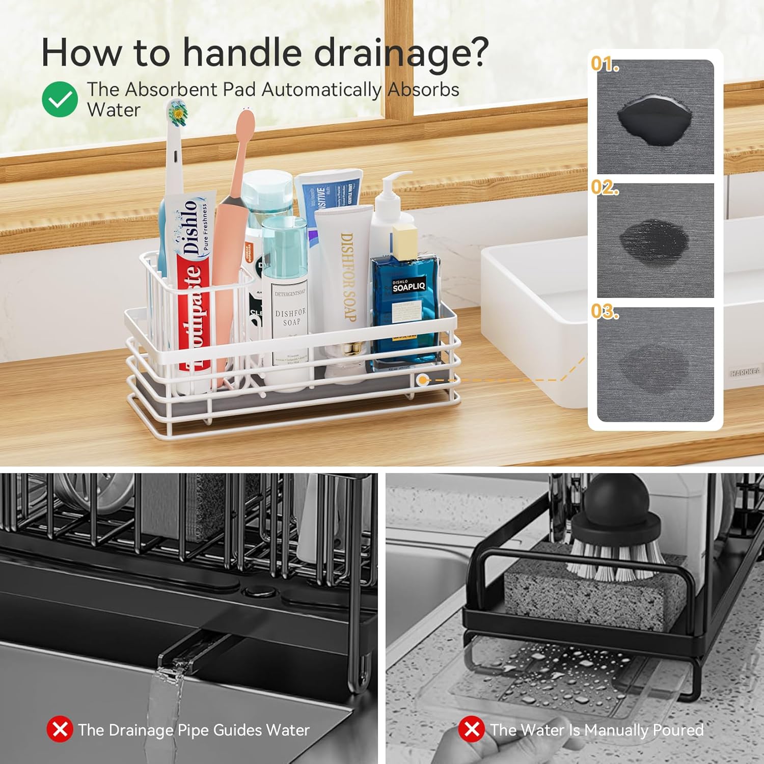 - ă60 Second Quick Dryingă: Our kitchen sink caddy features a diatomaceous earth absorbent pad that automatically absorbs water and dries in 60 seconds