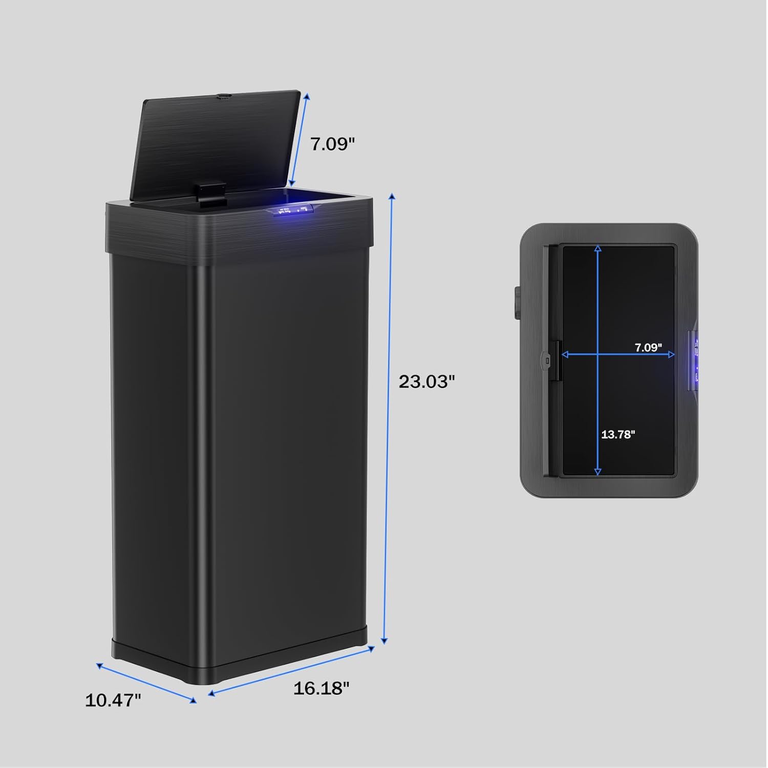 - 【Soft-Close Lid and Integrated Design】Sensor trash can lid has a slow-closing function, ensuring each closure is gentle and quiet, reducing noise and disturbance to nearby people while also enhancing the trash can's sealing ability. Trash can opening measures 13.78 × 7.09 inches, making it easy to deliver even large items