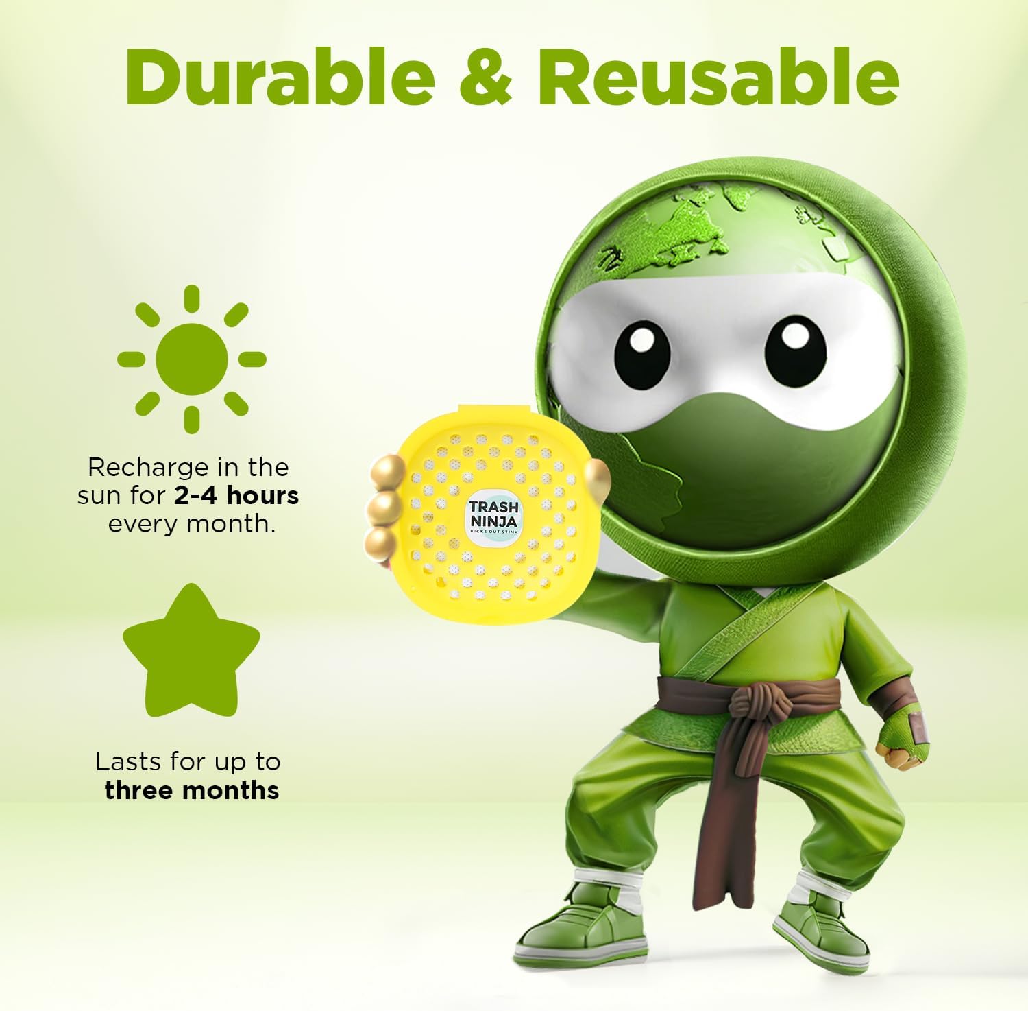- SIMPLE AND EASY TO USE: Stick the trash can smell eliminator to the lid, and let it work. Recharge monthly in sunlight for up to 3 months of freshness, saving you time and money!