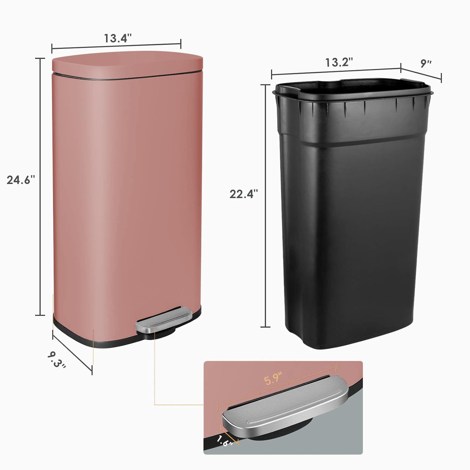 - 【REMOVABLE INNER BARREL】Kitchen trash can is equipped with a detachable plastic inner bucket, the straight shape can hold more trash and facilitate the replacement of trash bags. Inner barrel has no ends and gaps, which is very convenient for daily cleaning.When the garbage bag accidentally bursts and overflows, you can easily lift the removable inner bucket for cleaning.