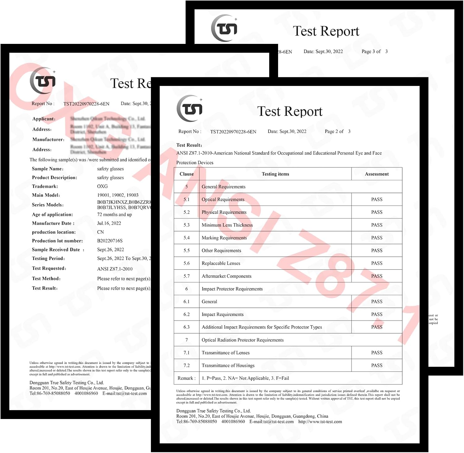 - Safety Always First: OXG safety glasses provide reliable eye protection against chemical splash, flying debris, spray, fluid or saliva droplets, making them ideal for industrial, commercial and housework. Compliance with ANSI Z87.1 Standards.