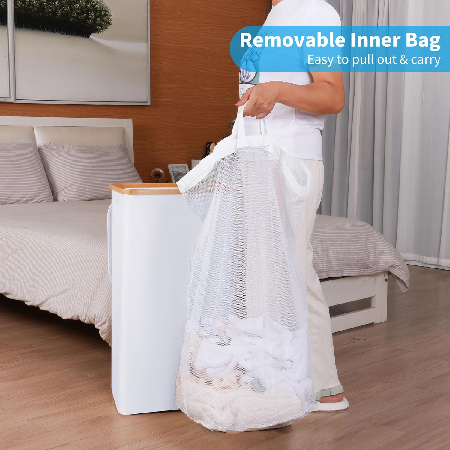 - 【Bamboo Handles and Removable Liner】The Laundry bin comes with sturdy bamboo handles for easy carrying and a removable inner bag for convenient laundry sorting and machine washing. The bamboo handles offer a natural, eco-friendly touch, while the liner simplifies the laundry process, keeping your space organized and clean.