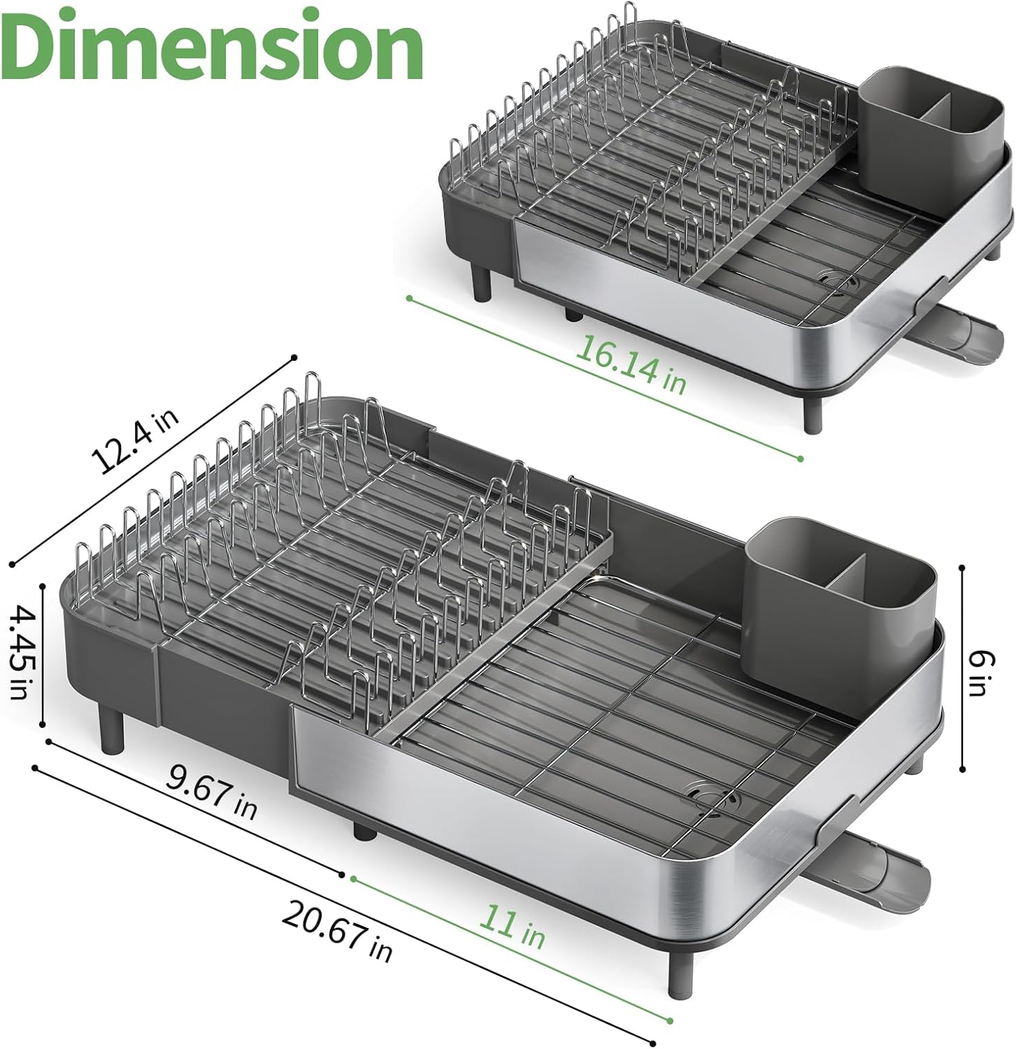 - [Expandable Design] This dish drainer can easily adjusts between 16.1" and 20.6" making it suitable for any kitchen countertop.When extended, it provides ample space for dishes, cups, and utensils. With this dish drying rack, you can perfectly save your countertop space
