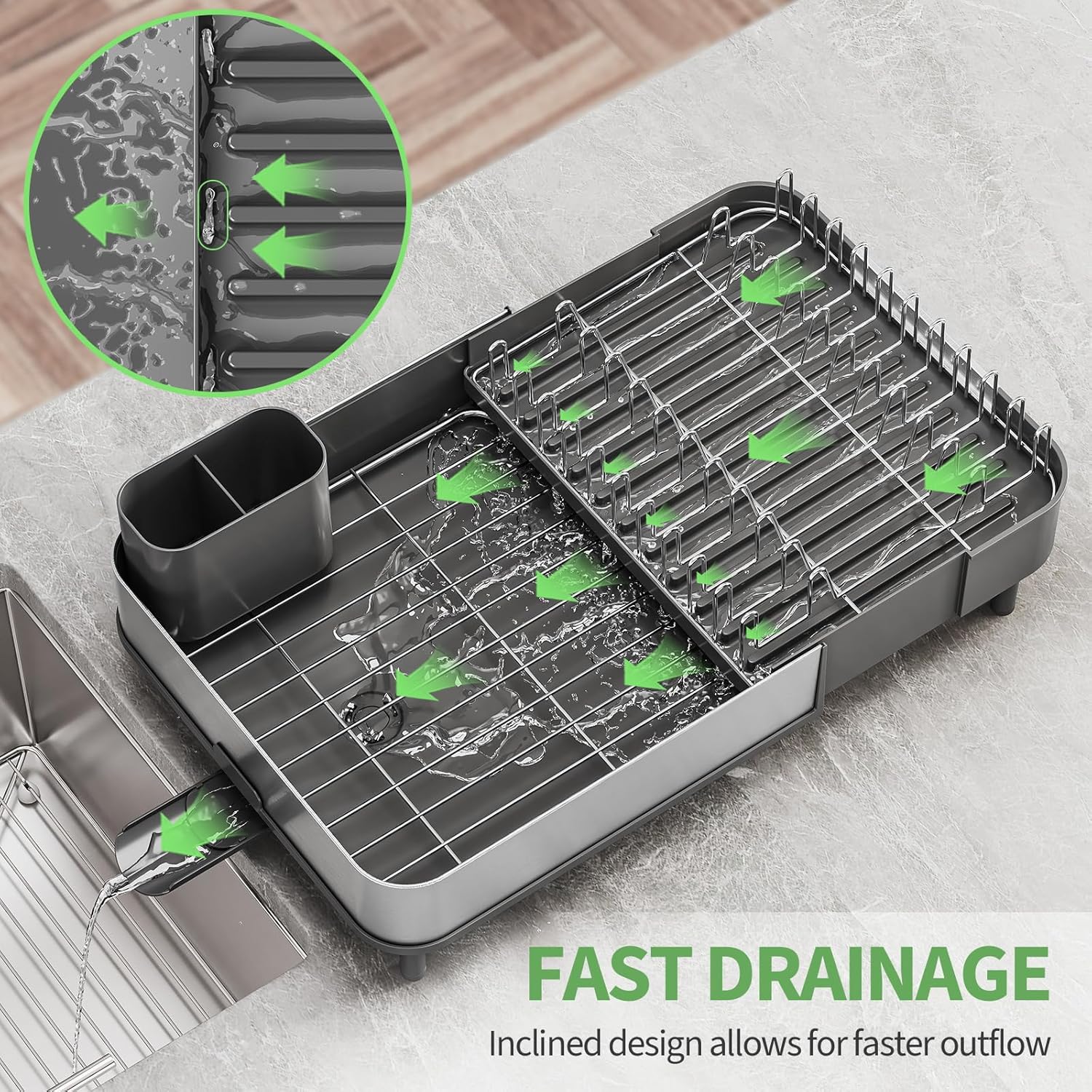 - [Efficient Drainage System] Featuring a water outlet, this extendable dish strainer drains water in a short time. With an elevated spout positioned 1.85 inches above the countertop, the dish rack efficiently directs water into the sink, even for self-rimming sinks
