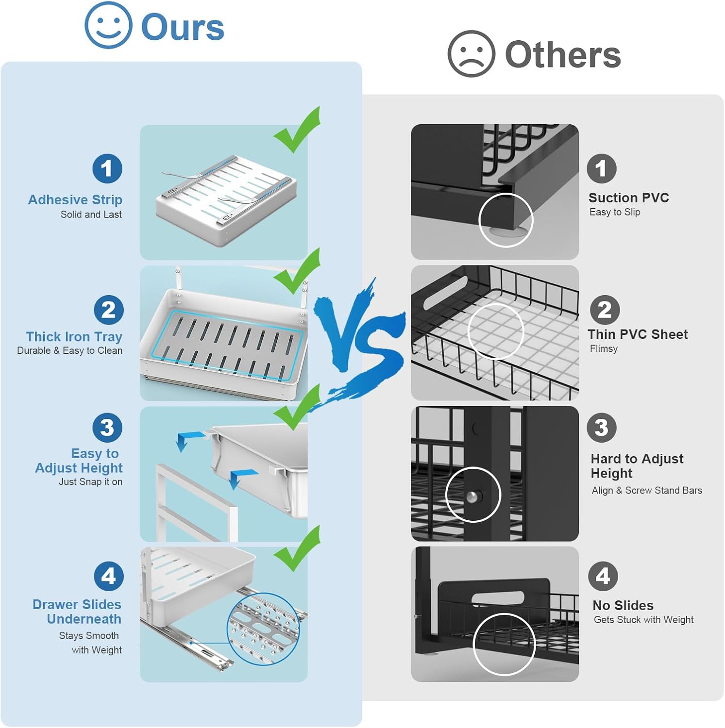 - 【Smooth Drawer Slide Underneath】 – While those wires-enabled rails easily get suck by applied weights, this drawer is with framed sliders underneath enabling permanently smooth slide with max. load of 40 lbs. Being applied by adhesive strips rather than suction cups makes the slide even more stable and durable.