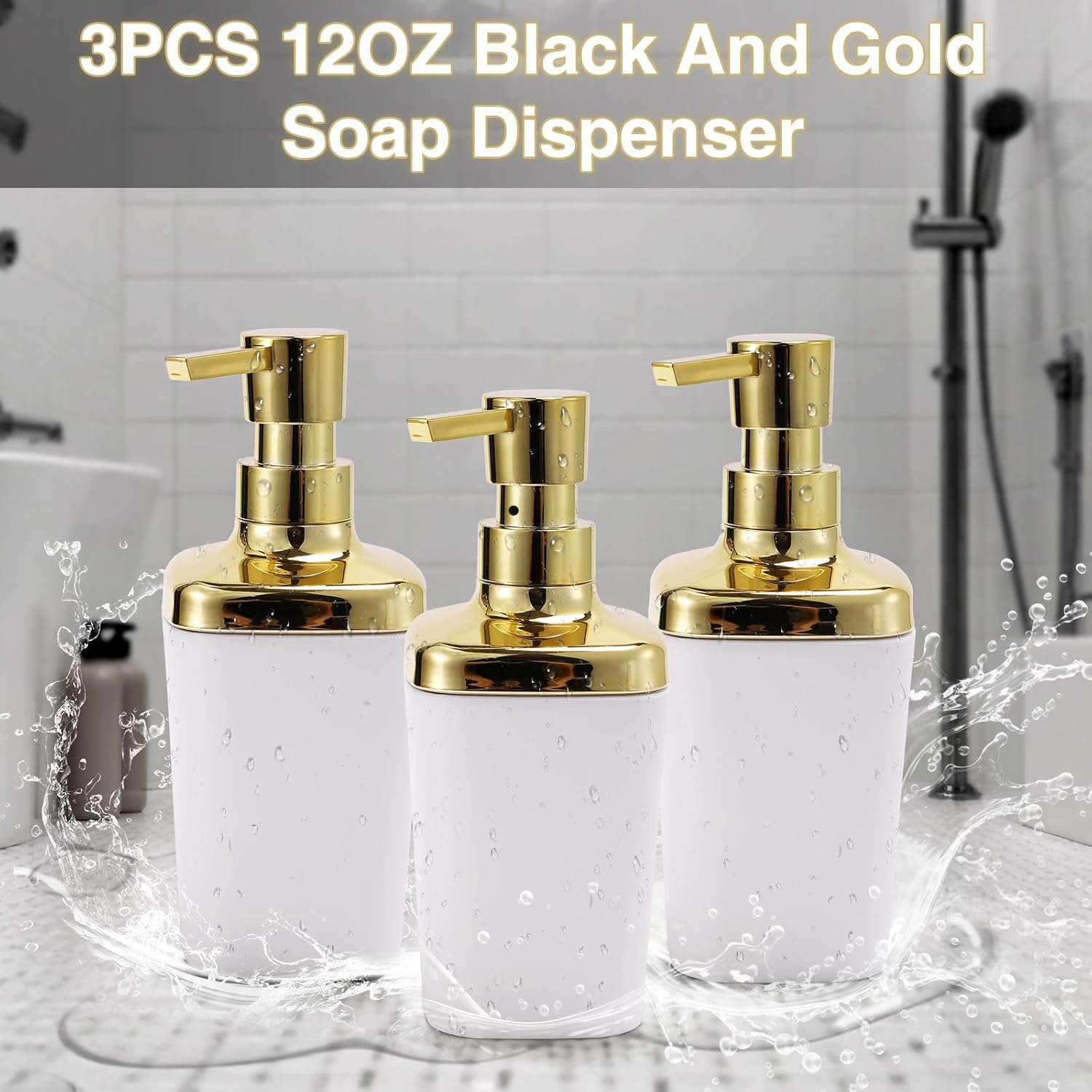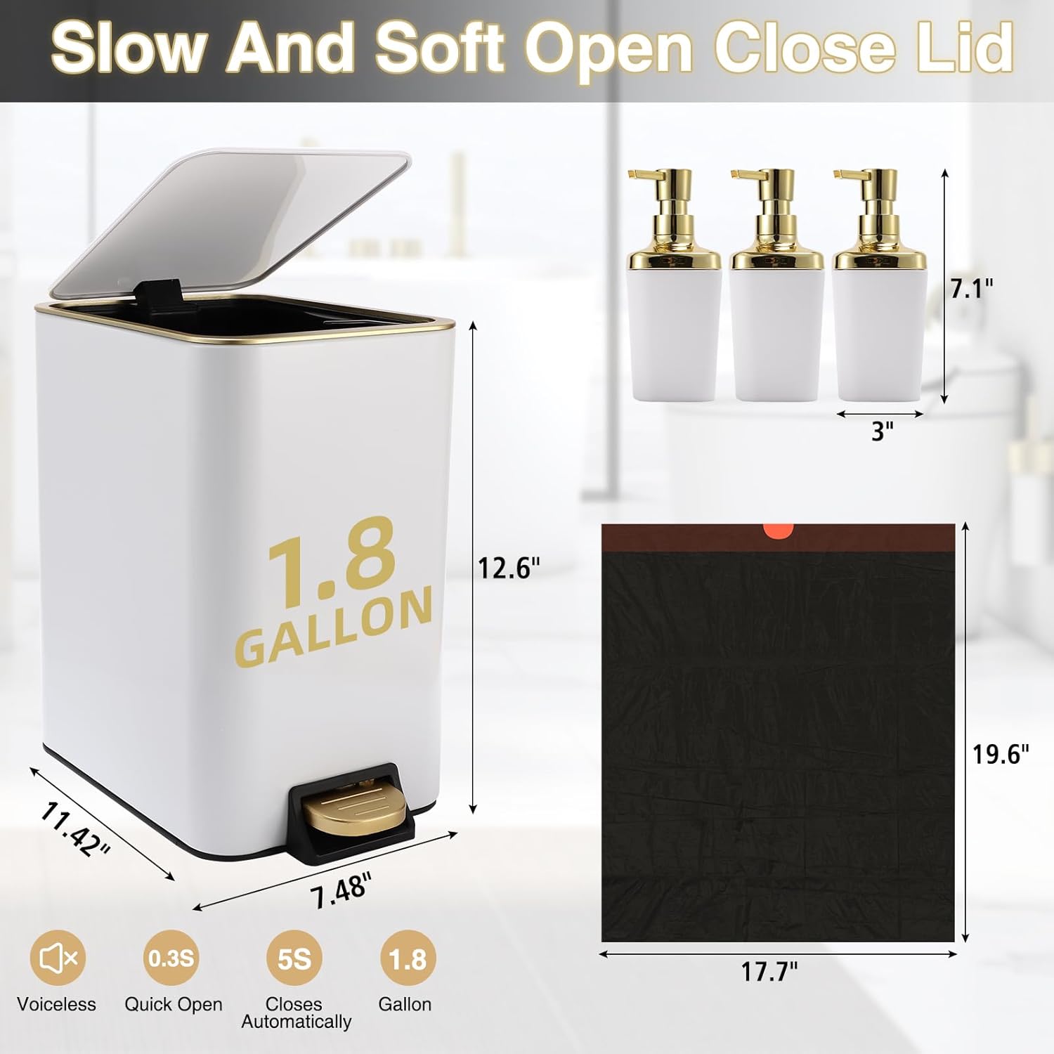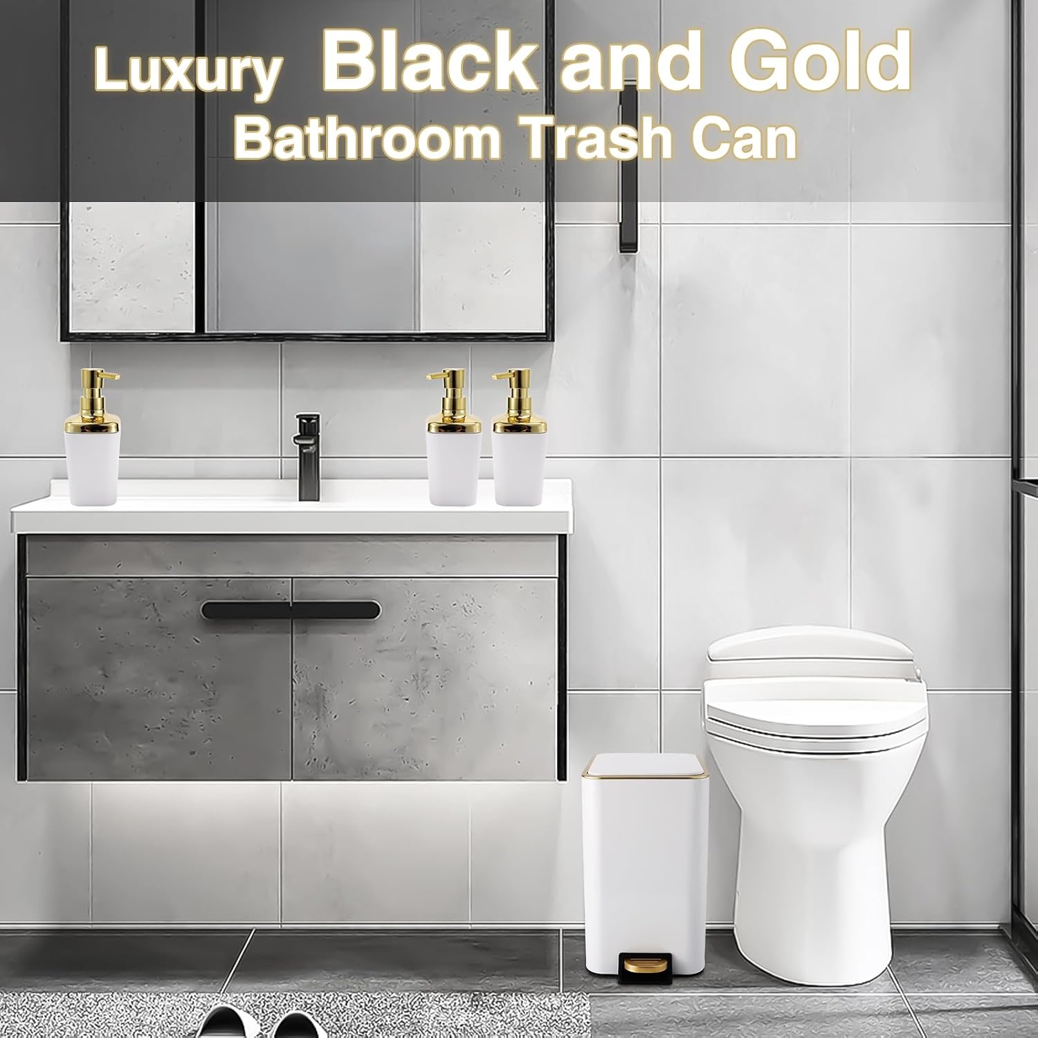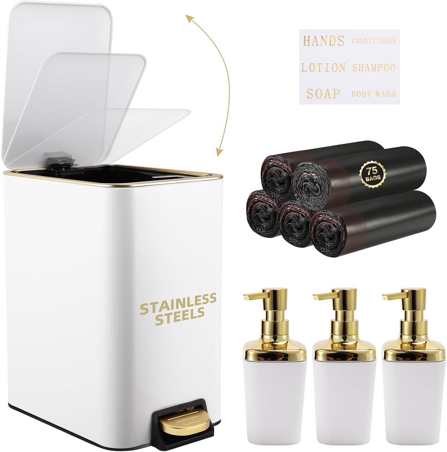 - [Package Included]:Trash can,3PCS Soap Dispenser,75 Count 5 Gallon Trash Bag,6 Waterproof Tags. each accessory is carefully selected to meet your daily needs.Our black and gold bathroom set is not only practical but also beautiful, making your bathroom space more neat and comfortable