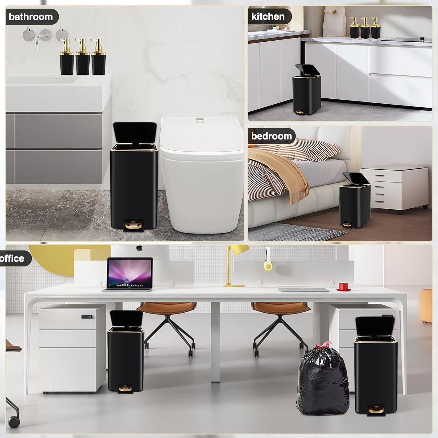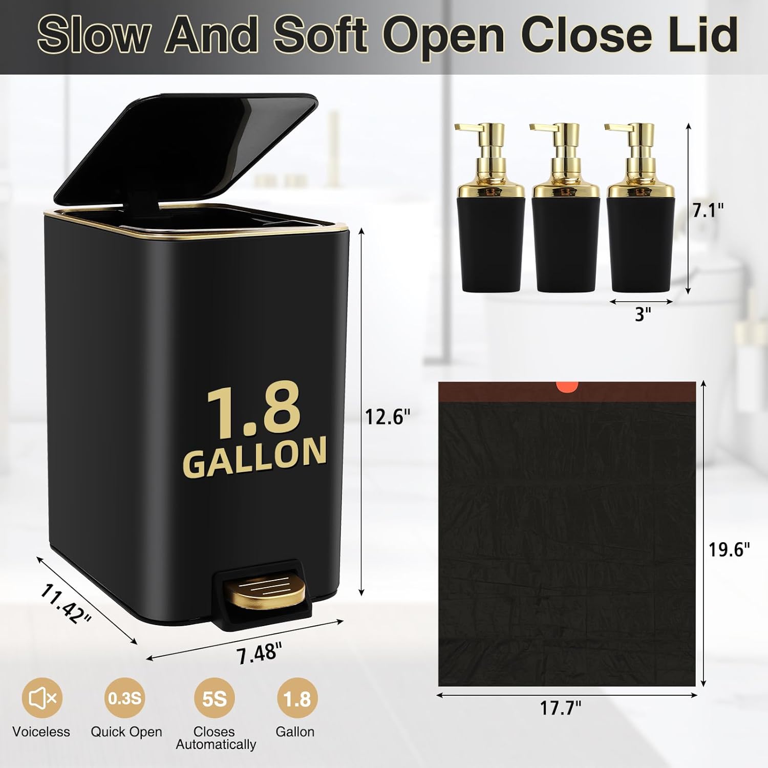 - [Package Included]:Trash can,3PCS Soap Dispenser,75 Count 5 Gallon Trash Bag,6 Waterproof Tags. each accessory is carefully selected to meet your daily needs.Our black and gold bathroom set is not only practical but also beautiful, making your bathroom space more neat and comfortable