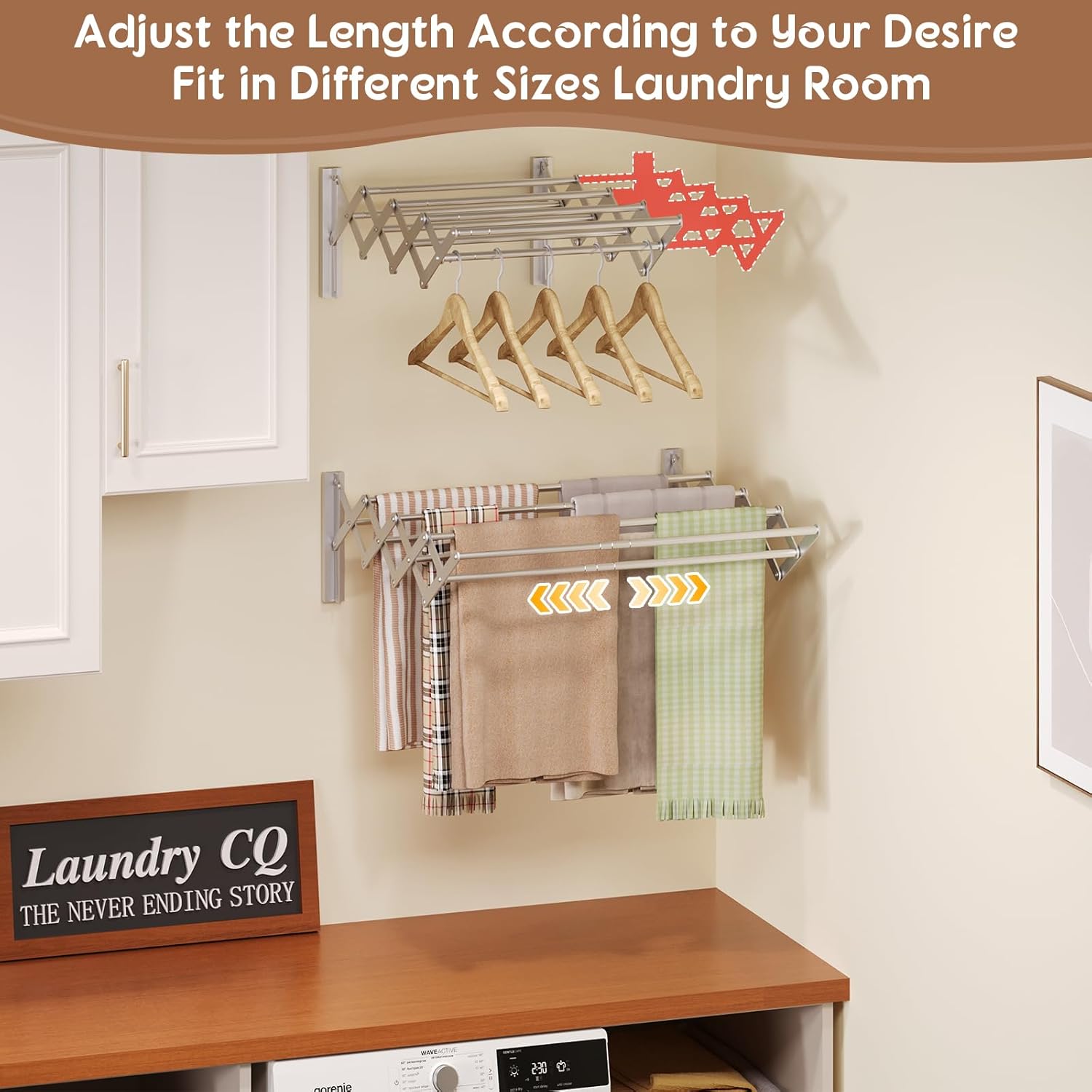 - Compact with Large Drying Space: Wall mounted and collapsible expandable design for max space helper, just expand when air drying; 8 rods 23 linear feet offers adequate hanging drying space.