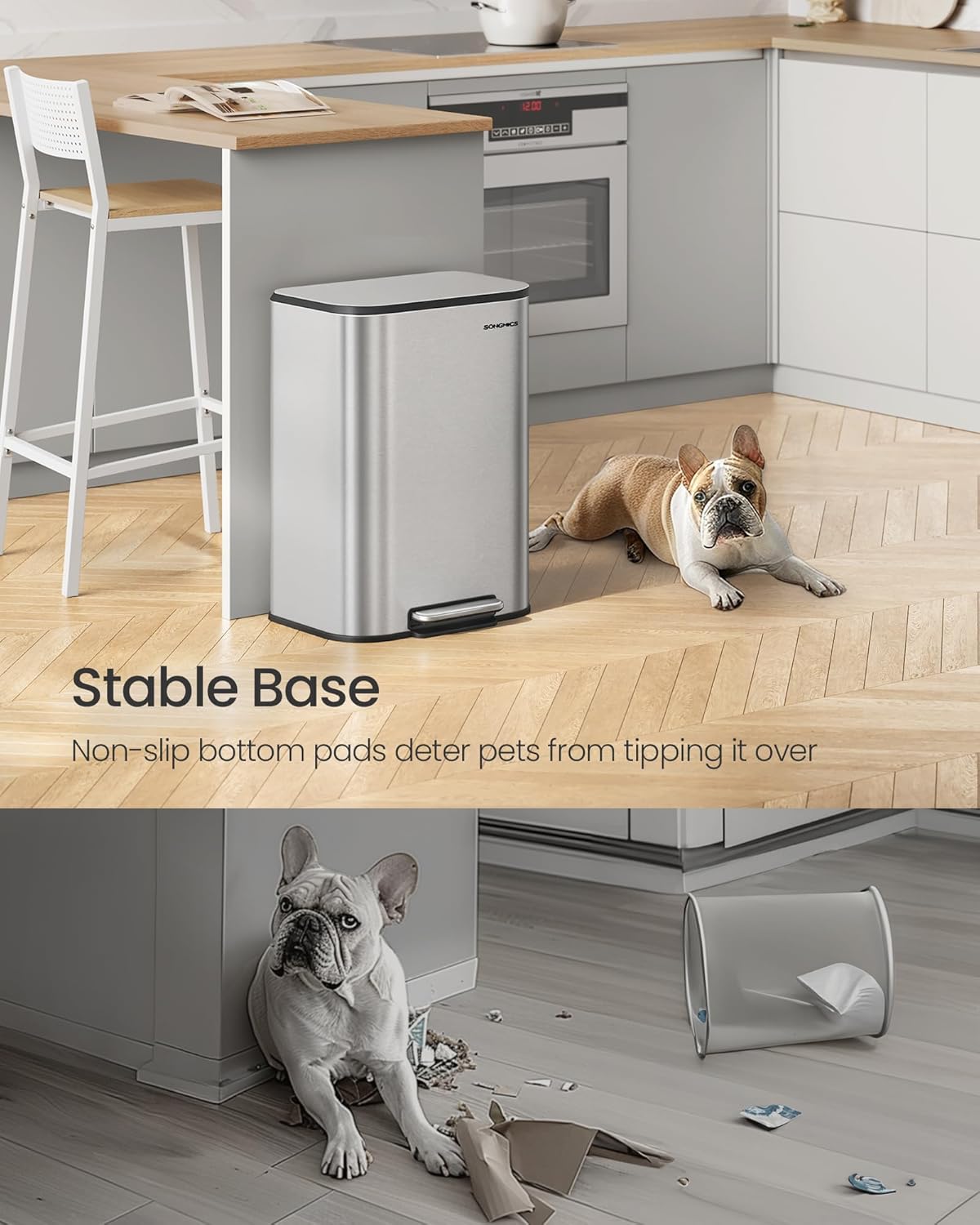 - [Durable and Stable] Made from robust stainless steel, this trash bin is resistant to rust, dirt, and is easy to clean. The base is equipped with non-slip pads to enhance stability, making it difficult for pets to tip it over