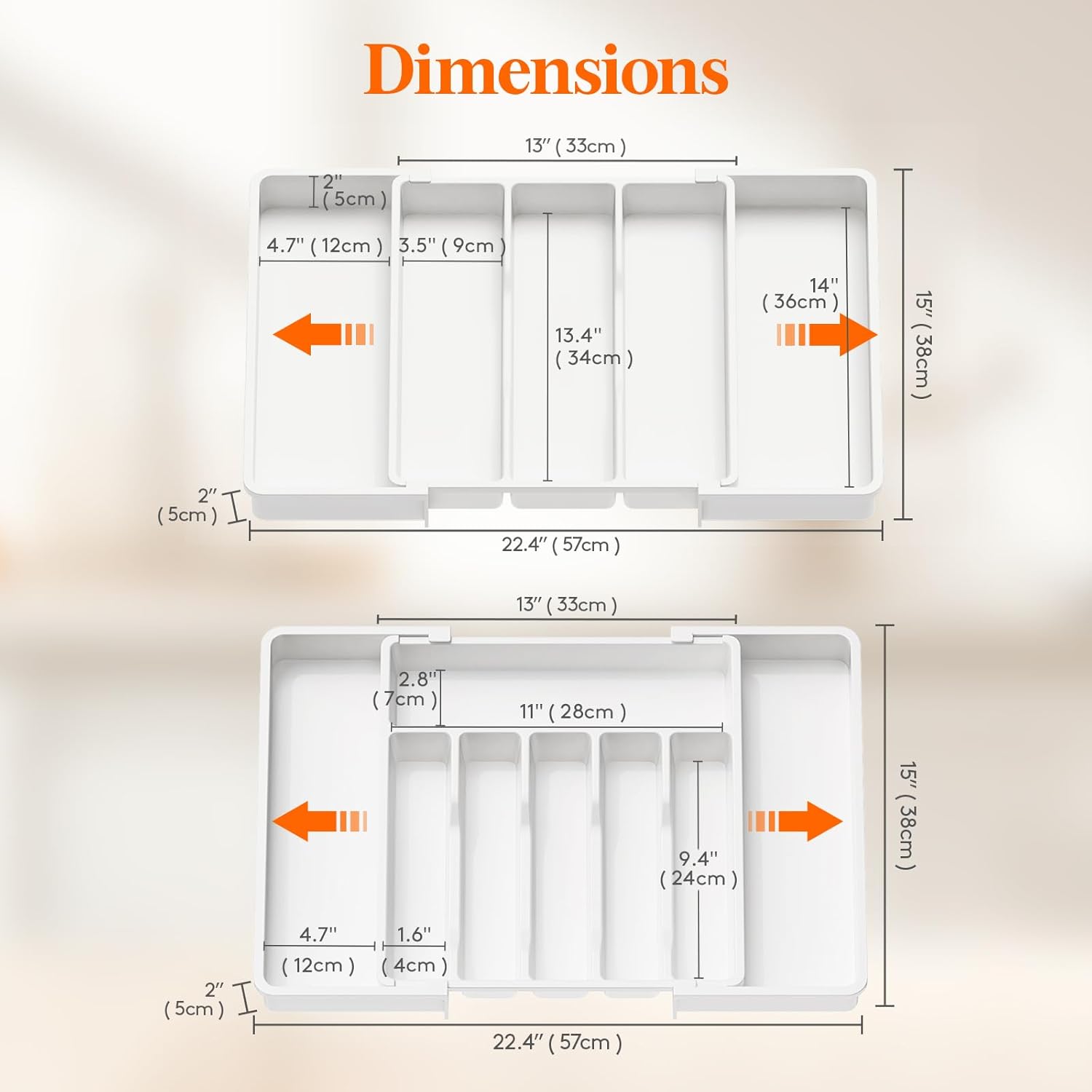 - Adjustable Size: With a width of 13 to 22.4 inches, each kitchen drawer organizer fits various drawer sizes. Fully expanded, the cutlery drawer organizer measures 22.4 x 15 x 2 inches, and when folded, it reduces to 13 x 15 x 2 inches, making it compatible with any kitchen drawer