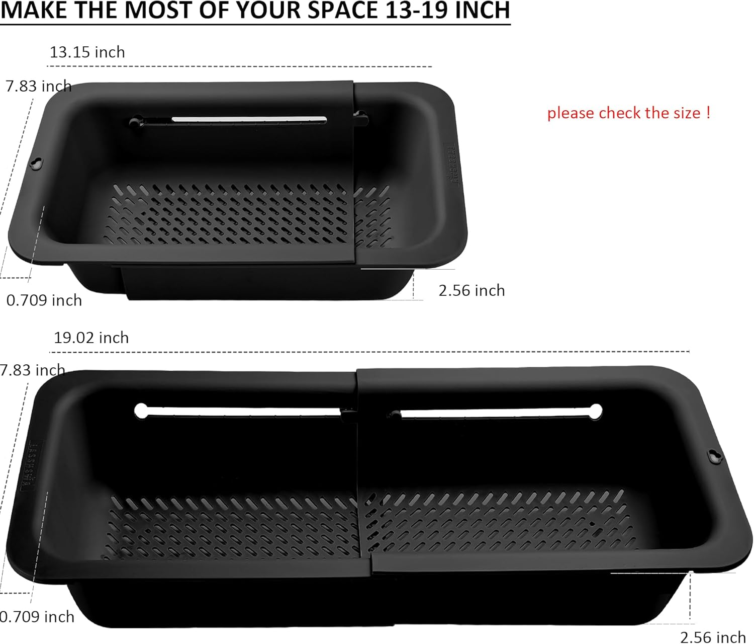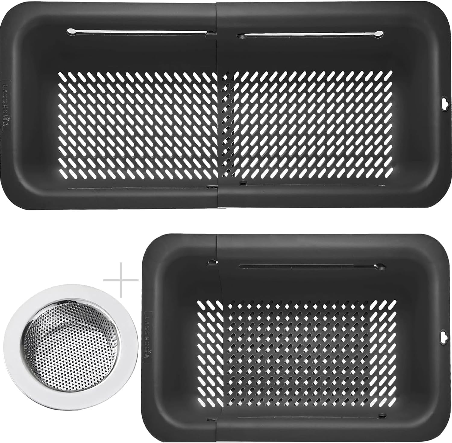 - LASSHSWA Over the sink extendable strainer, SIZE: 13-19 in (smaller space-saving design) . Stainless steel drain strainer, SIZE: Outer diameter: 4.5β; inner filter: 3β; depth: 1β . They fit for most kitchen sinks and drains.