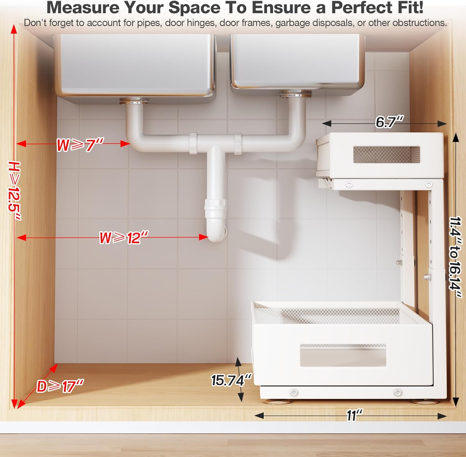 - 【2-Tier Pull-Out Design for Easy Access】This under-sink organizer features a double-layer pull-out design, allowing you to easily access items at the deepest part. The upgraded, thickened iron circular sliding rails ensure a smooth and seamless pulling experience, making each use effortless. The unique pull-out locking mechanism effectively prevents the drawers from being completely pulled out, avoiding the risk of items falling or structural damage caused by over-pulling, ensuring safer and more convenient use.