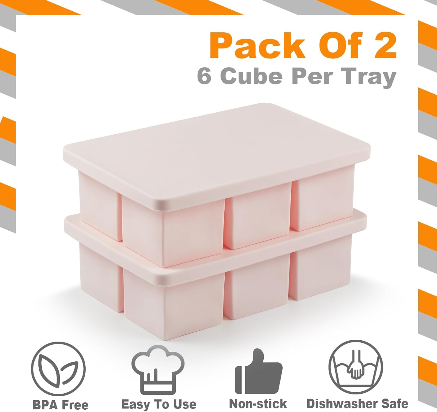- 2 Pack Large Ice Cube Tray With Lid: Comes with set of 2, 6 giant ice cubes per ice mold, 2 inch large per ice cube and shapes square; Perfect to chill cocktails, whiskey, tequila, vodka or other drinks with less dilution. You can also use these ice molds to freeze food in perfect portions, such as soup broth or sauce servings, recipes, baby food storage, meal prep, and portion controlled meals