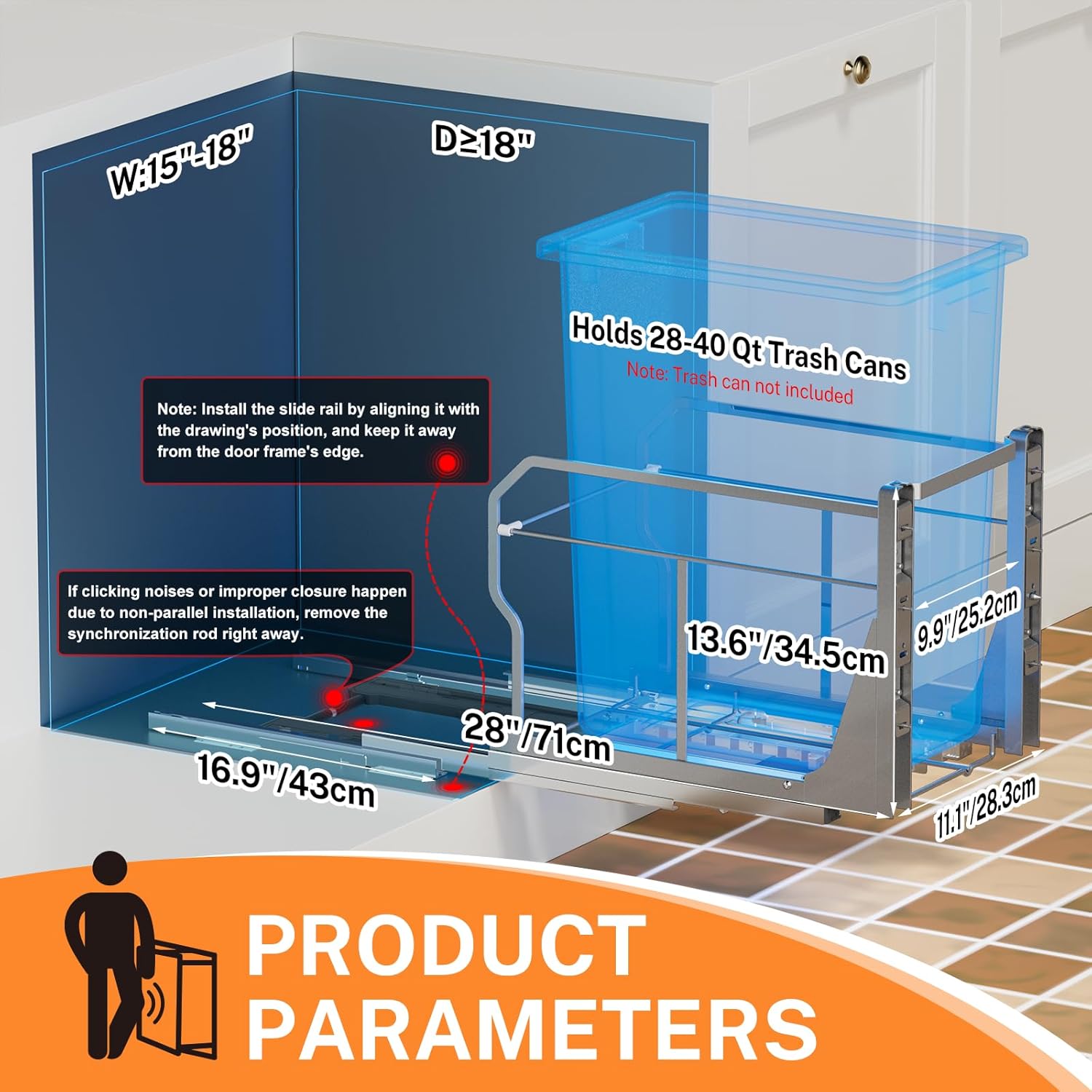 - Premiun Material: Trash can pull out for kitchen cabinet is made of high-quality carbon steel with a powder-coated surface, ensuring durability and rust resistance. It can be easily cleaned with a cloth. The frame has a load capacity of 100 pounds, which is 50 pounds more than regular slides.