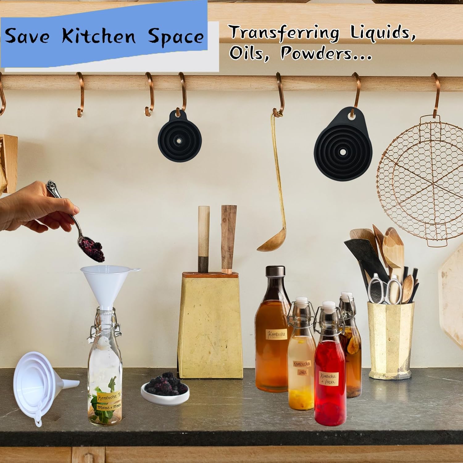 - Save More Space and Portable - The plastic funnel is stackable, the silicone funnel is foldable, and each funnel has hanging holes that can be easily hung on the wall or neatly placed in a drawer to save effective space in the kitchen. Our funnel for the kitchen is also easy to carry more than stainless steel metal funnel.