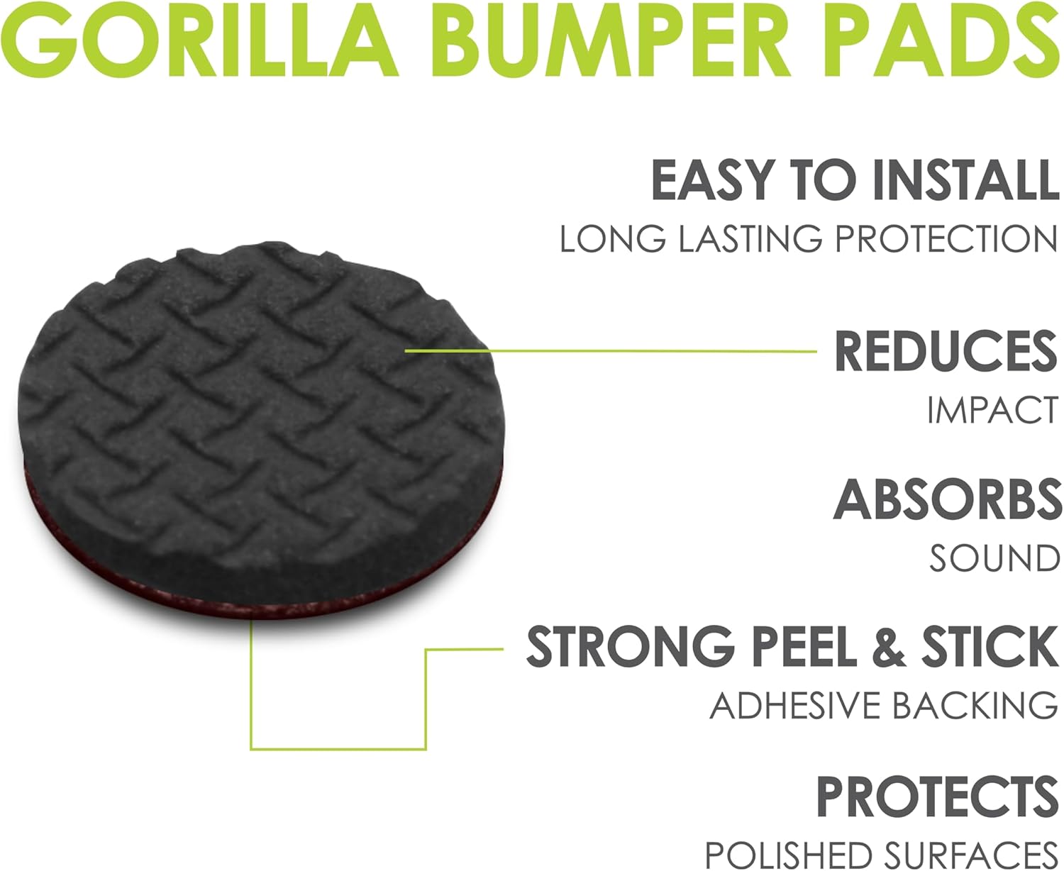 - 64 Premium ½ inch round rubber bumpers – Includes 64 adhesive door bumper pads that are ½”(13mm) diameter x 1/8” (3mm) thick. Gorillapad drawer and cabinet stoppers are made from special formulated rubber foam for lasting protection, feature extra sticky backings for a quick and easy stick on attachment, and are covered by a 1-year free replacement warranty should product fail due to premature wear.
