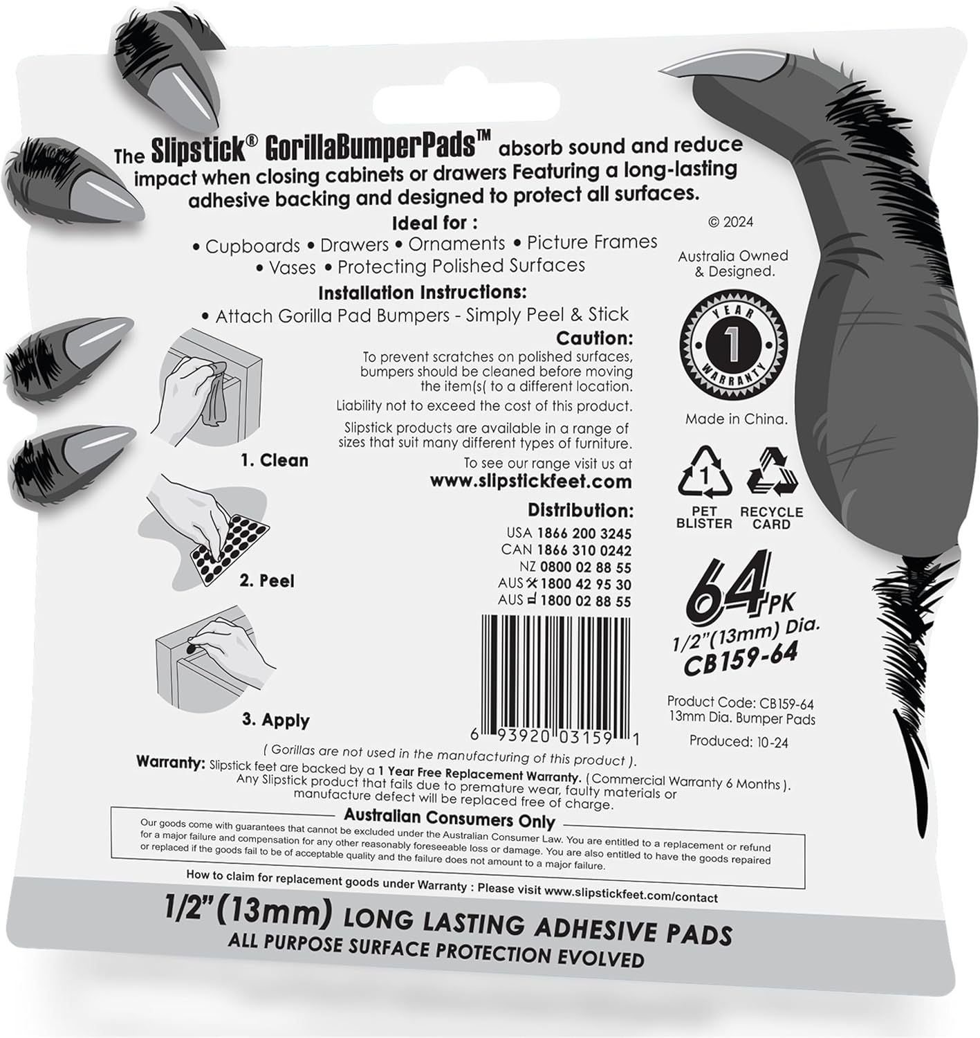 - Rubber feet with strong self-stick adhesive – Features a strong multi-functional adhesive backing to ensure these little rubber bumpers stay in place and securely stick to glass, wood, ceramic, metal, plastic, marble, polished surfaces, and more. Slipstick Gorillapad door bumpers are great for sticking to bottoms of cutting boards, wooden boxes, doors, plant pots, cabinets, kitchen furniture, walls, inside drawers, and any other small items or decor that needs cushioning, surface protection or sound dampening.