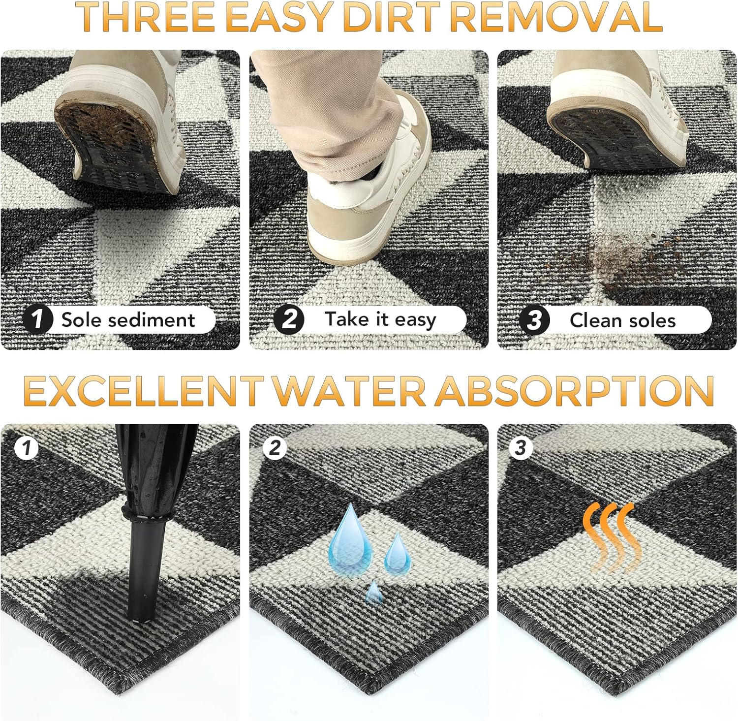 - Durable & NON-SLIP: Our Indoor Doormat is made of high-quality absorbent polypropylene fabric, uses double layer technology which absorb moisture and dirt from shoes quickly, makes your floors clean and dry. And the non-skid TPR rubber backing won't scuff floors, perfect for both indoor and outdoor use.