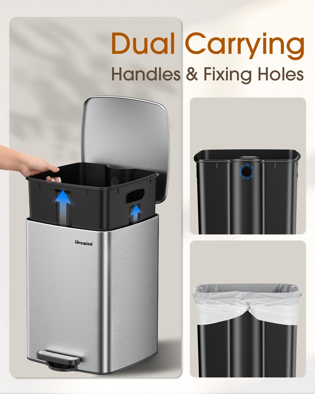 - Stainless Steel Construction: Our kitchen trash can is made from high-quality stainless steel, ensuring durability and resistance to rust and stains