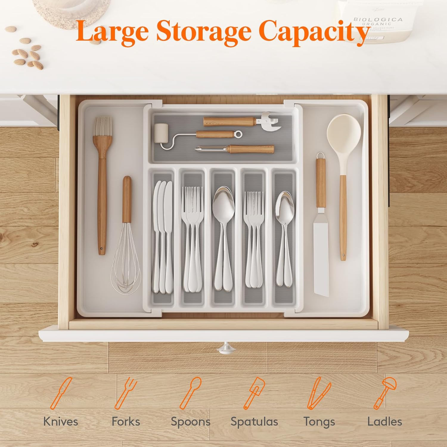 - Large Capacity: This cutlery drawer organizer features six middle compartments and two expandable side panels to maximize storage space for utensils, cookware, and various kitchen items, keeping your kitchen drawers tidy
