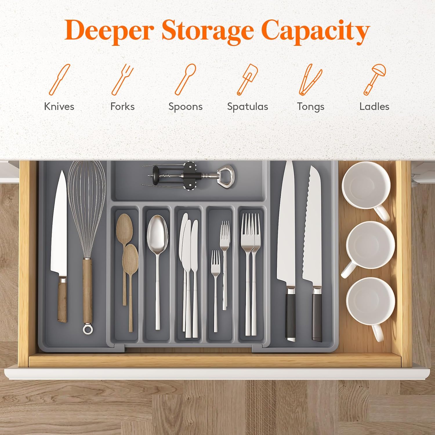 - Sort Your Silverware: The silverware tray comes with 6-8 compartments, creating more space in drawers for spoons, cutlery, and flatware. Streamline your cooking with a no-install organizer that keeps cutlery at your fingertips