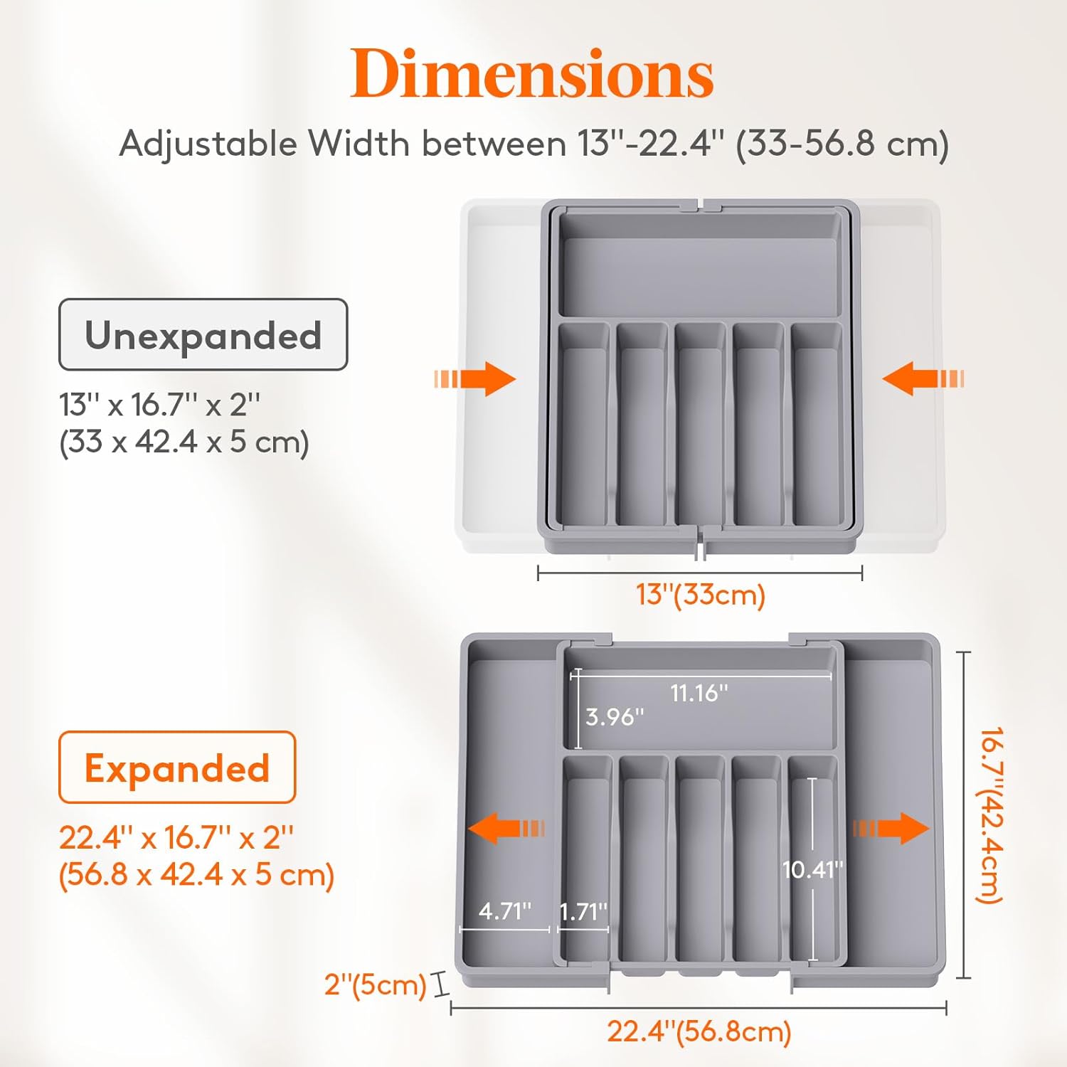 - Adjustable Design: With its retractable design, The Lifewit silverware organizer fits drawers of various sizes and shapes. It measures 13'' wide when folded while reaching 22.4'' when fully expanded. This universal utensil drawer organizer helps you maximize storage space efficiently while keeping your utensils neatly organized and easily accessible