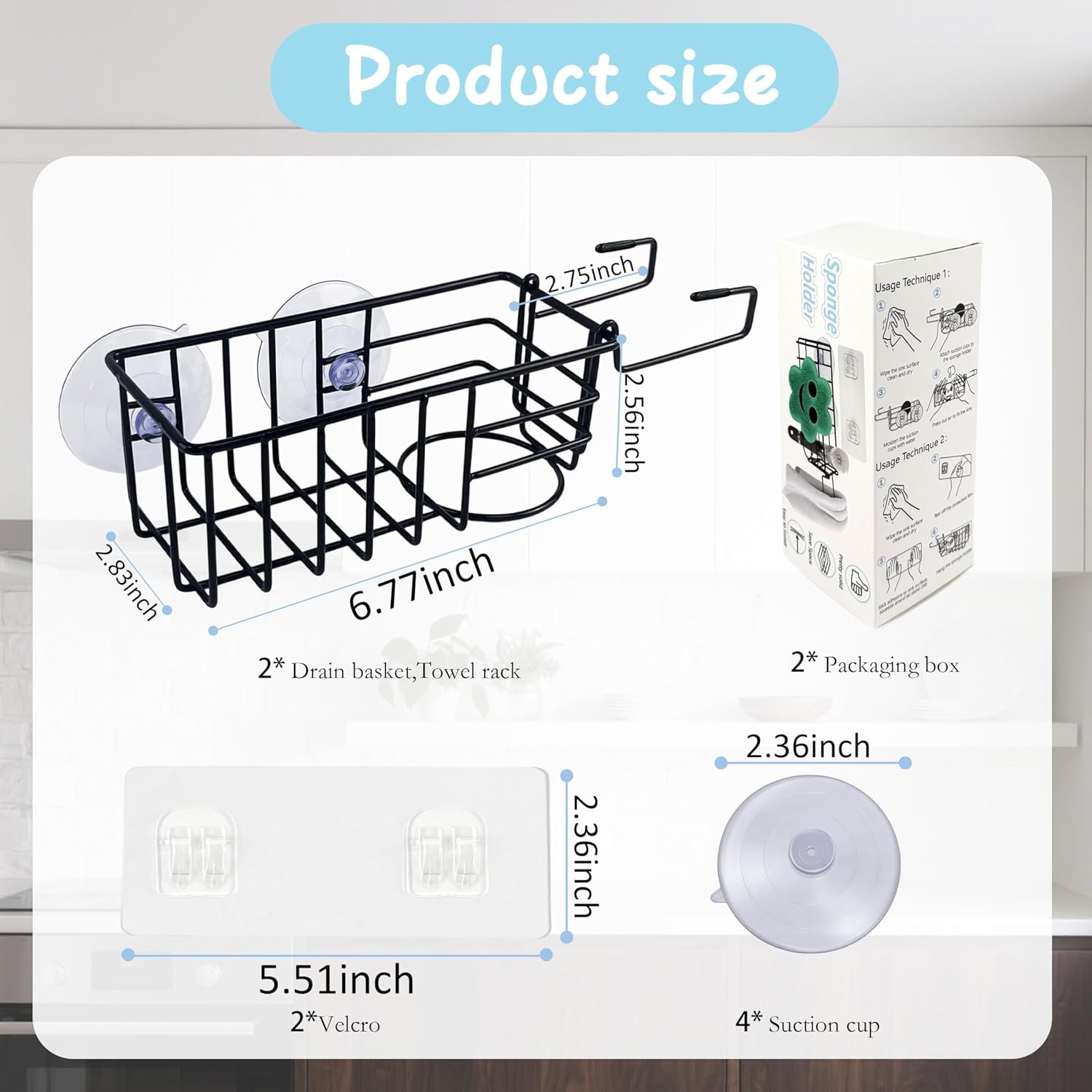 Sponge Holder with Dish Cloth Hanger for Kitchen Sink, in-Sink Caddy Organizer with Suction Cups & Adhesive Strips, Rustproof Sponge Rack for Soap, Brush, Scrubber - Black(2 Pack)
