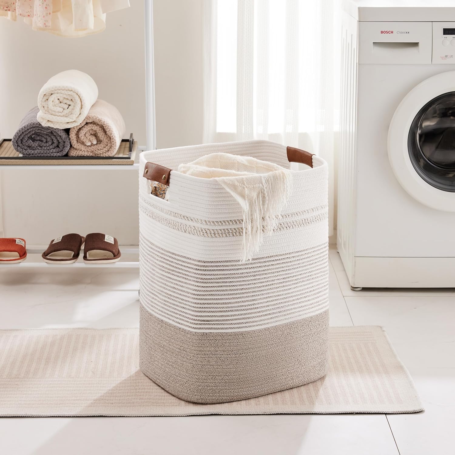 85L Tall Laundry Hamper with Handles for Living Room Storage, Extra Large Woven Rope Baskets Bin for Blanket, Kids Toy, Gifts, Wicker Hamper for Bedroom Dirty Clothes, 17"x14"x22" White Brown
