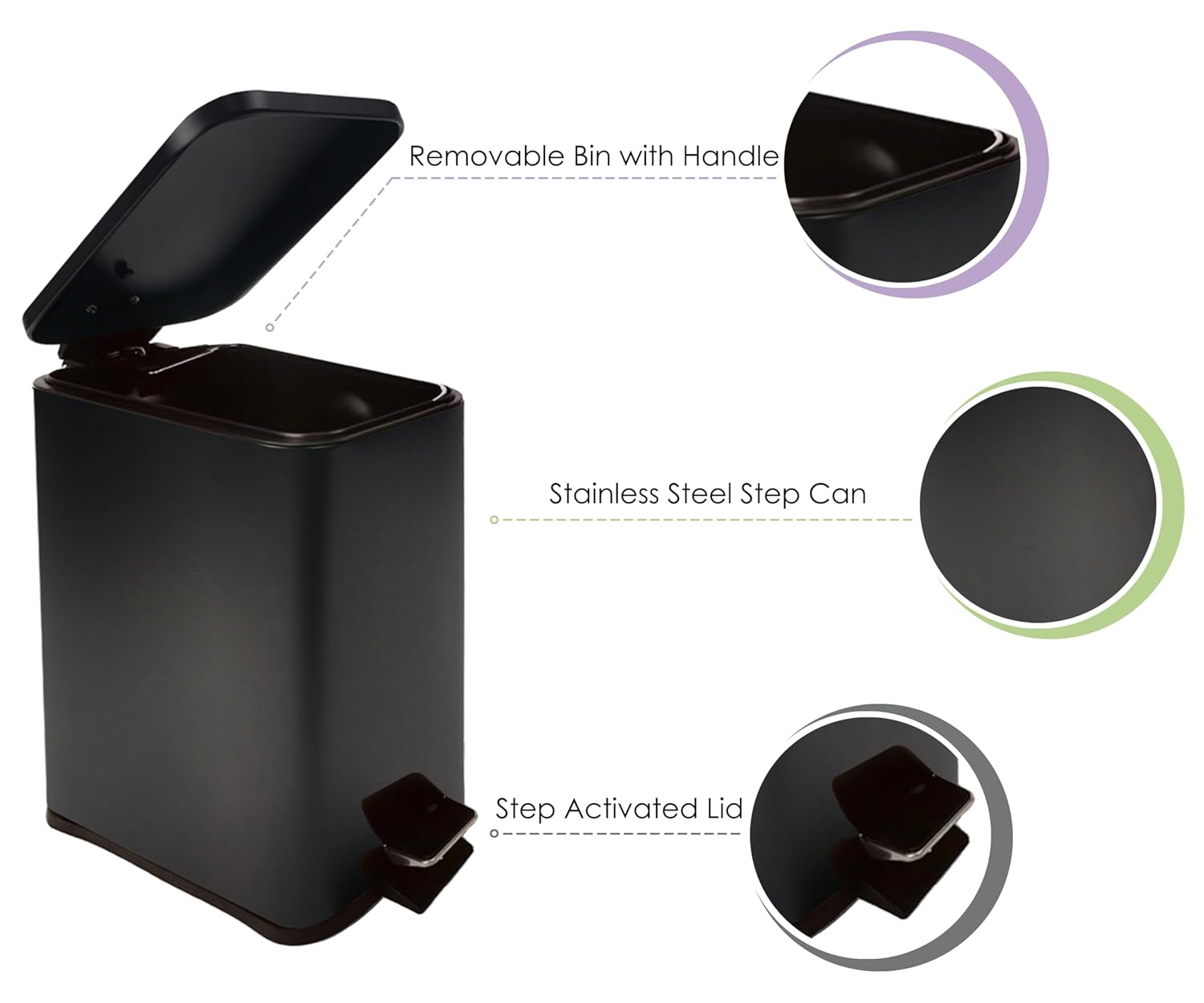 - Elegant and Functional Design: This modern step trash can is the ideal blend of practicality and sophistication. Measuring 8.65"x5.5"x11.2", it adds a stylish touch to your bathroom trash can with lid, trash can kitchen, or office decor while efficiently managing waste.
