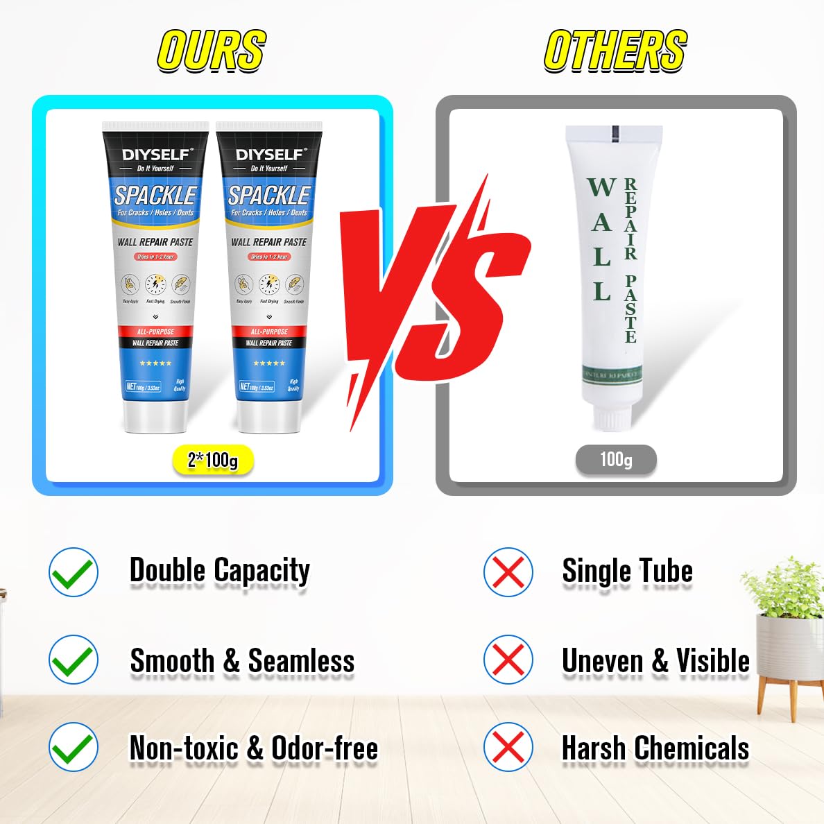 - Complete & Versatile Repair Kit: The DIYSELF 18-pack drywall repair kit includes all the essentials: 2x 100g wall spackle, 2x nozzle extenders, 2x rubber gloves, 2x sandpapers, 4x plastic scrapers, and drywall patch in multiple sizes. Ideal for fixing cracks, holes, stains, and peeling on walls, ceilings, and common interior surfaces.