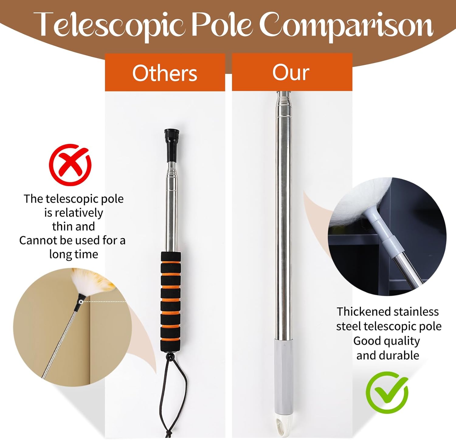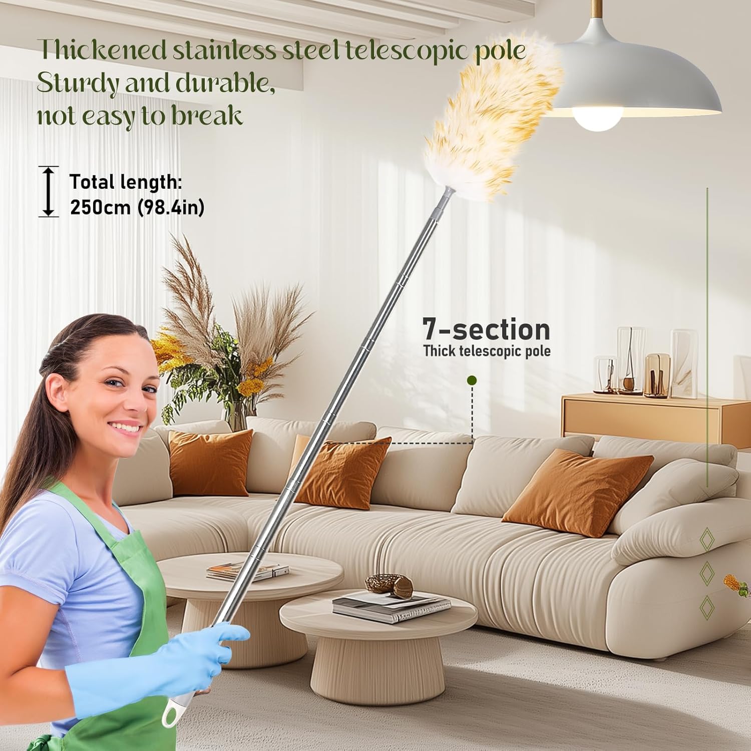 - HIGH QUALITY LAMBWOOLS FEATHER DUSTER: Stainless steel telescopic pole design easily sweeps away dust from high places, making roof cleaning simple! Screw-type detachable design, easy to connect, longer service life, easy to store and save space
