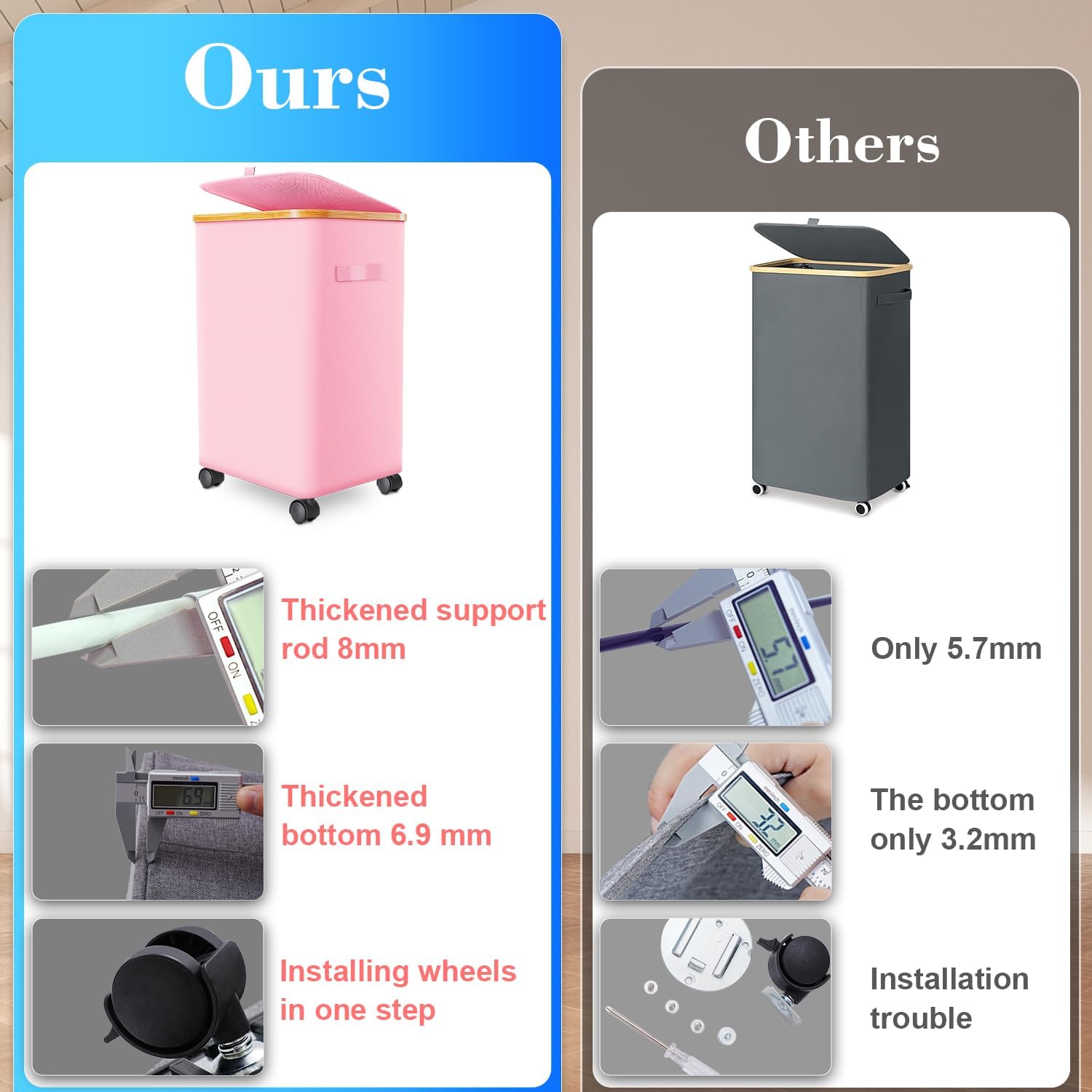 Laundry Hamper with Wheels,20 Gal (75L) Laundry Basket with lid Rolling Clothes Hamper Foldable Dirty Clothes Basket on wheels with Bamboo Frame and Bag for Bedroom, Dorm, Laundry Room-Pink