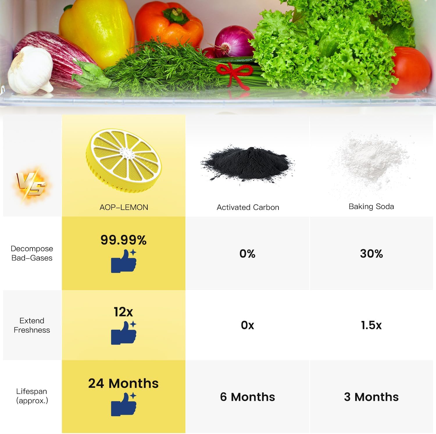 - Advanced Refrigerator Deodorizer β Destroy Fridge Odors Naturally: Lab-tested AOP-KF Solid Alkali Technology absorbs and neutralizes stubborn kitchen odors (fish, spoiled milk, garlic) β no masking, zero residue.