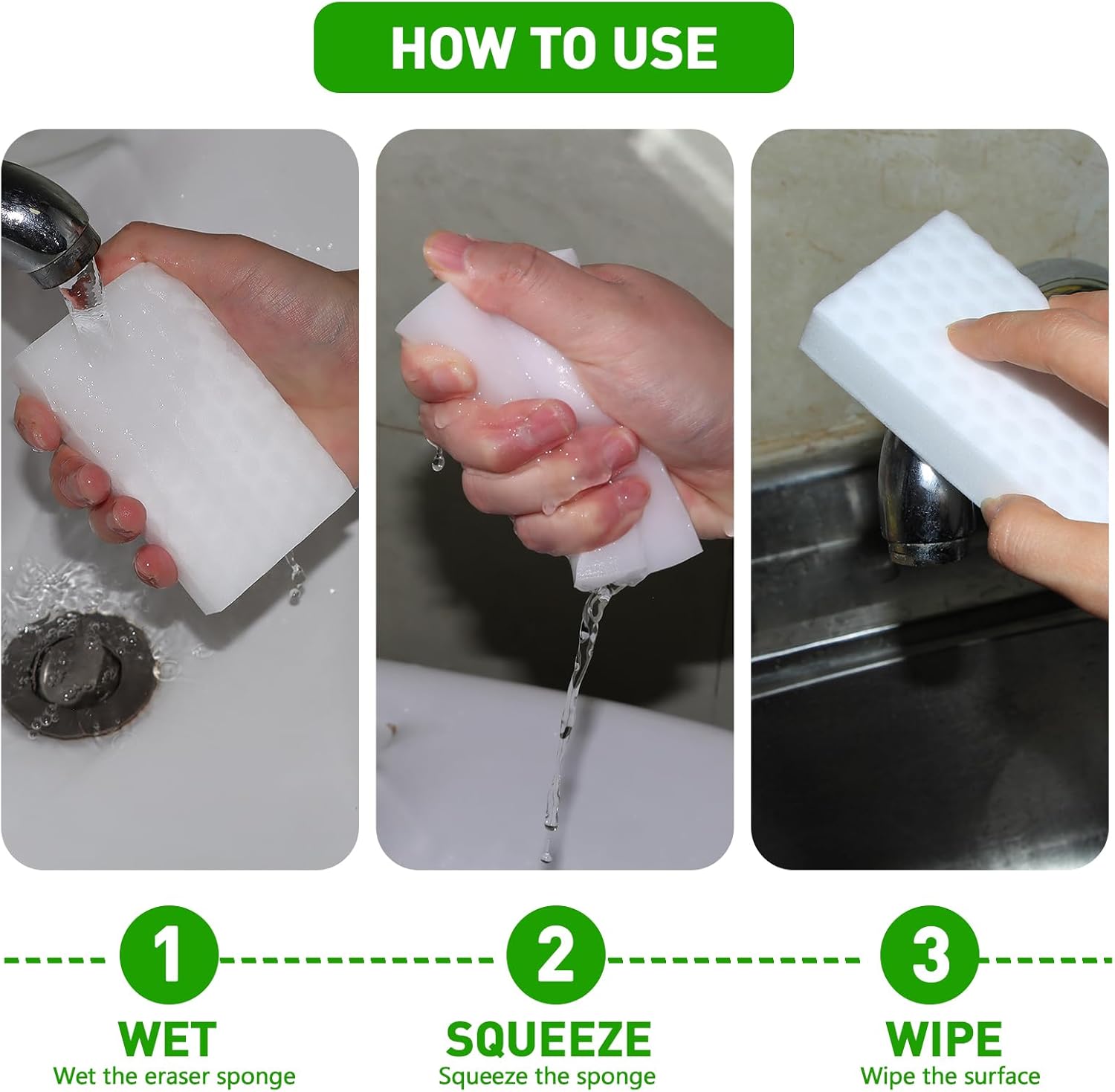 - Easy to Use Clean Eraser: This gentle yet effective cleaning method involves simply wetting the sponge with water, squeezing it, and wiping the surface. The eraser sponge is odorless and non-toxic, making it a magical and safe cleaning solution that enhances your daily life.