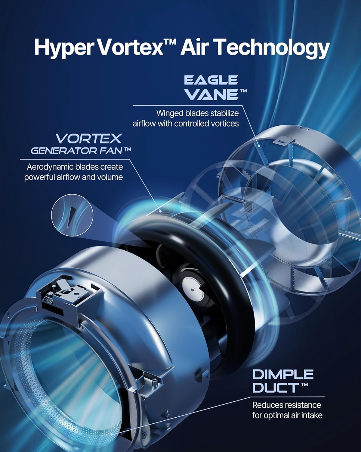 - AERODYNAMIC AIR PURIFICATION HyperVortex air technology optimizes airflow, enhances filtration efficiency, minimizes airloss, all with remarkable speed and whisper-quiet operation at 21.6 db. Covers up to 2,640 ft² in just 60 mins - CADR: Dust 376, Smoke 352, Pollen 419