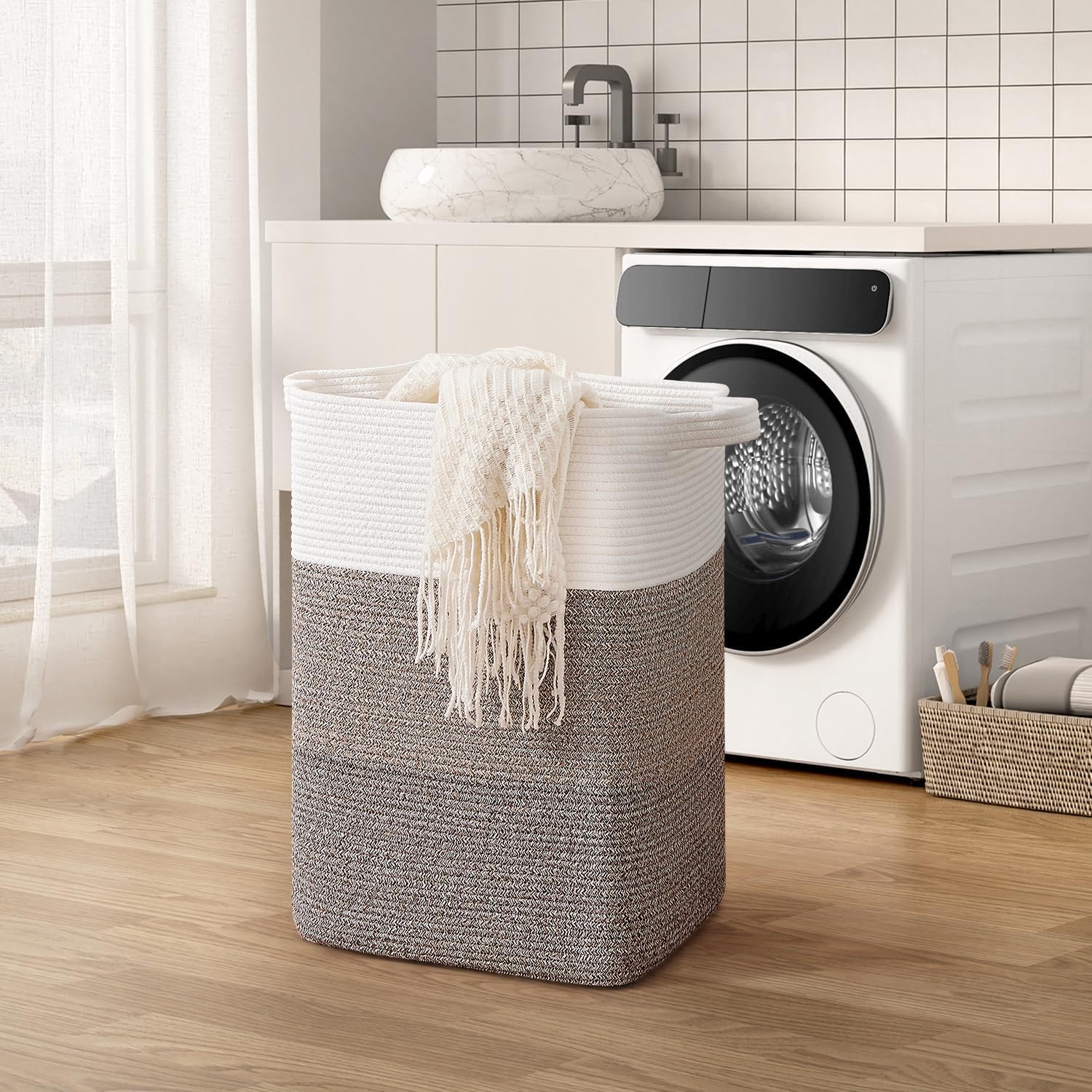 CLHMILY&Z 75L Laundry Hamper Rectangular Cotton Rope Basket - 16x13x22 Inches - Durable and Soft Storage Bin for Clothes, Toys, and Nursery Essentials, Brown & White