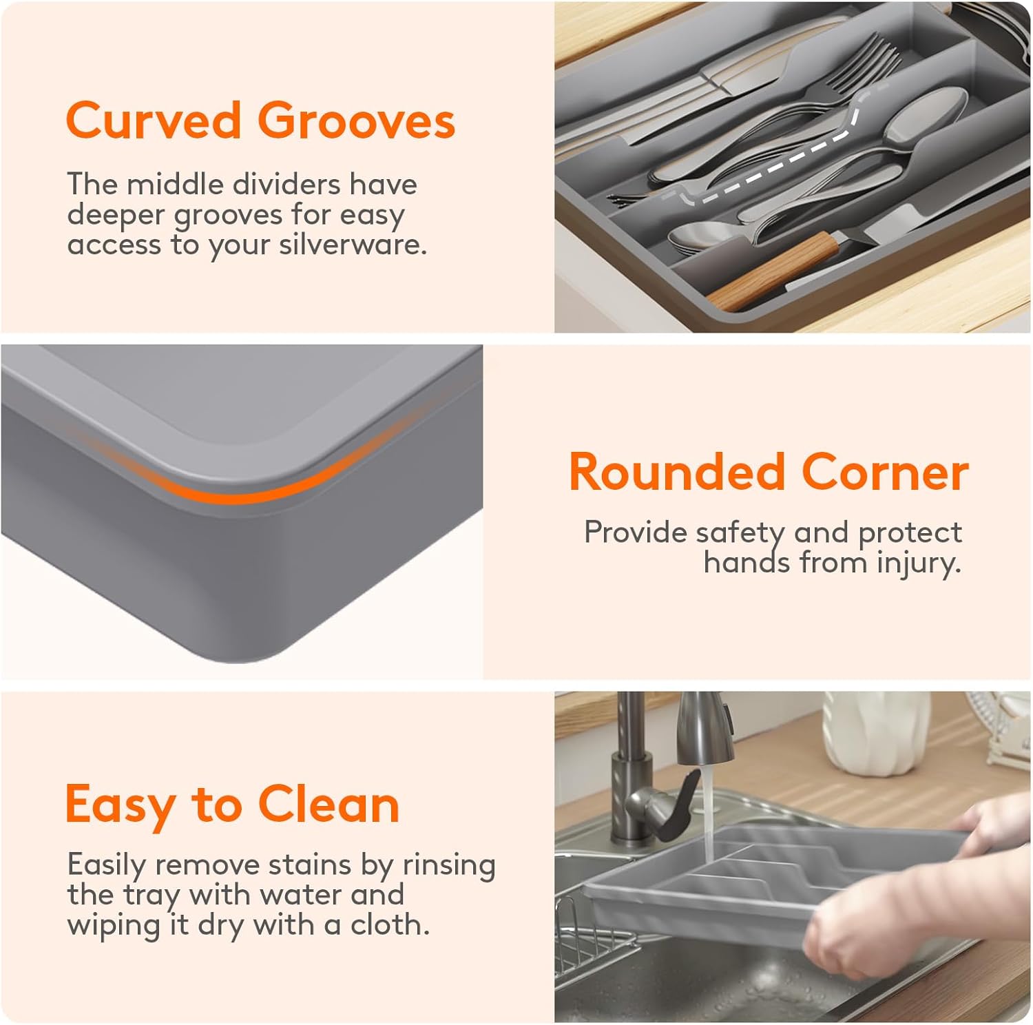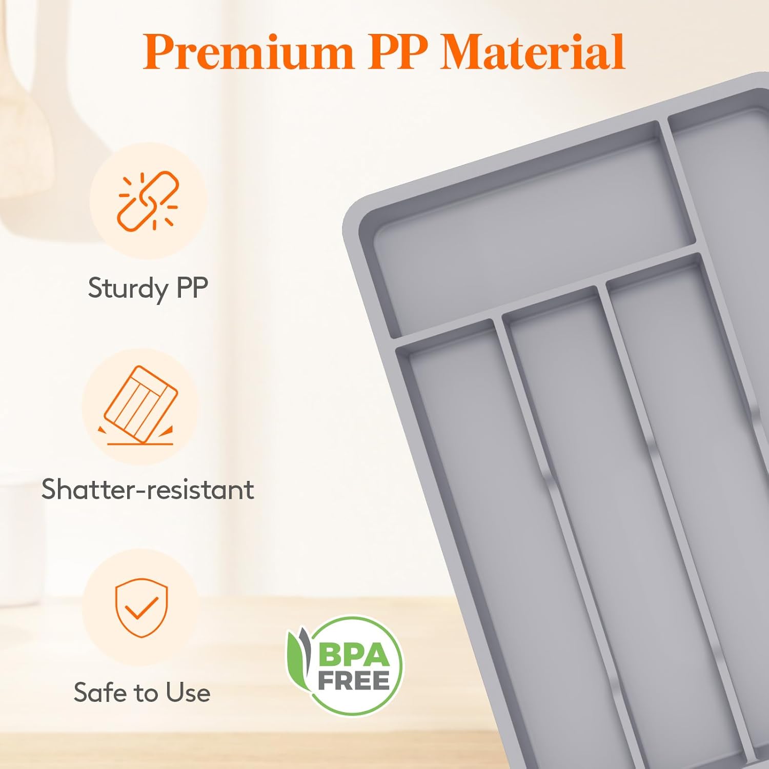 - Robust and Safe: This kitchen drawer organizer is crafted from premium PP material, BPA-free and built to last. It ensures your silverware is stored in a healthy, safe environment for worry-free use